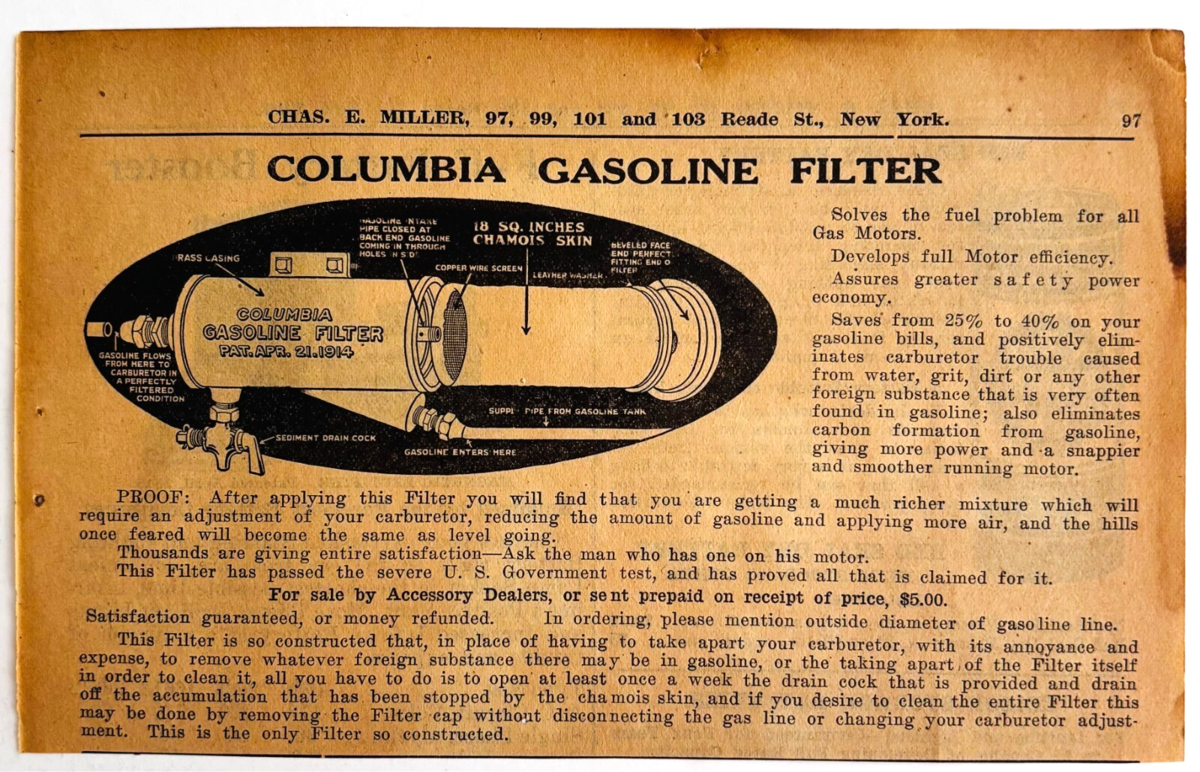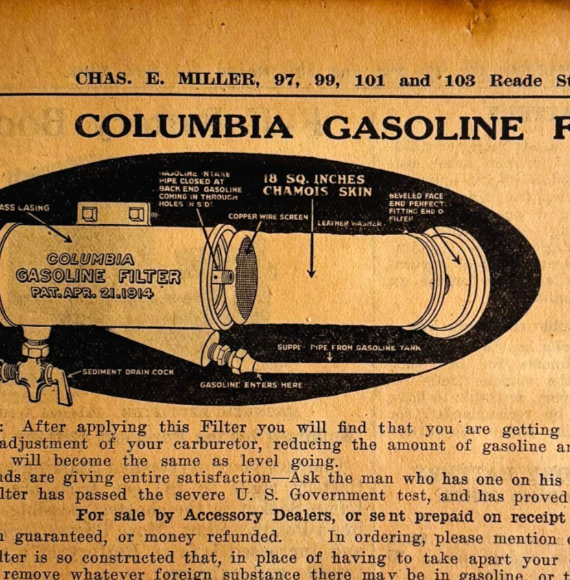 - 1917 Columbia Gasoline Filter Auto Advertisement Chas Miller Automobilia F14A