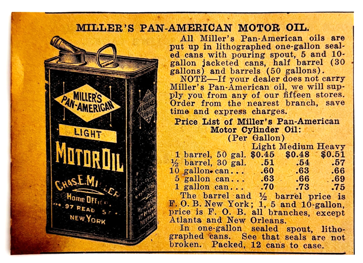 - 1917 Miller's Pan American Motor Oil Advertisement Chas Miller Automobilia F14B