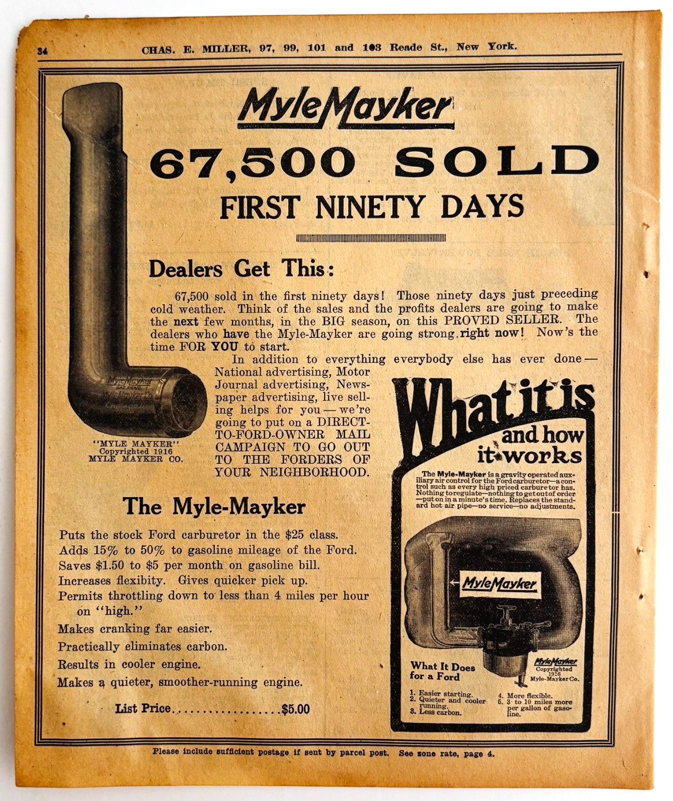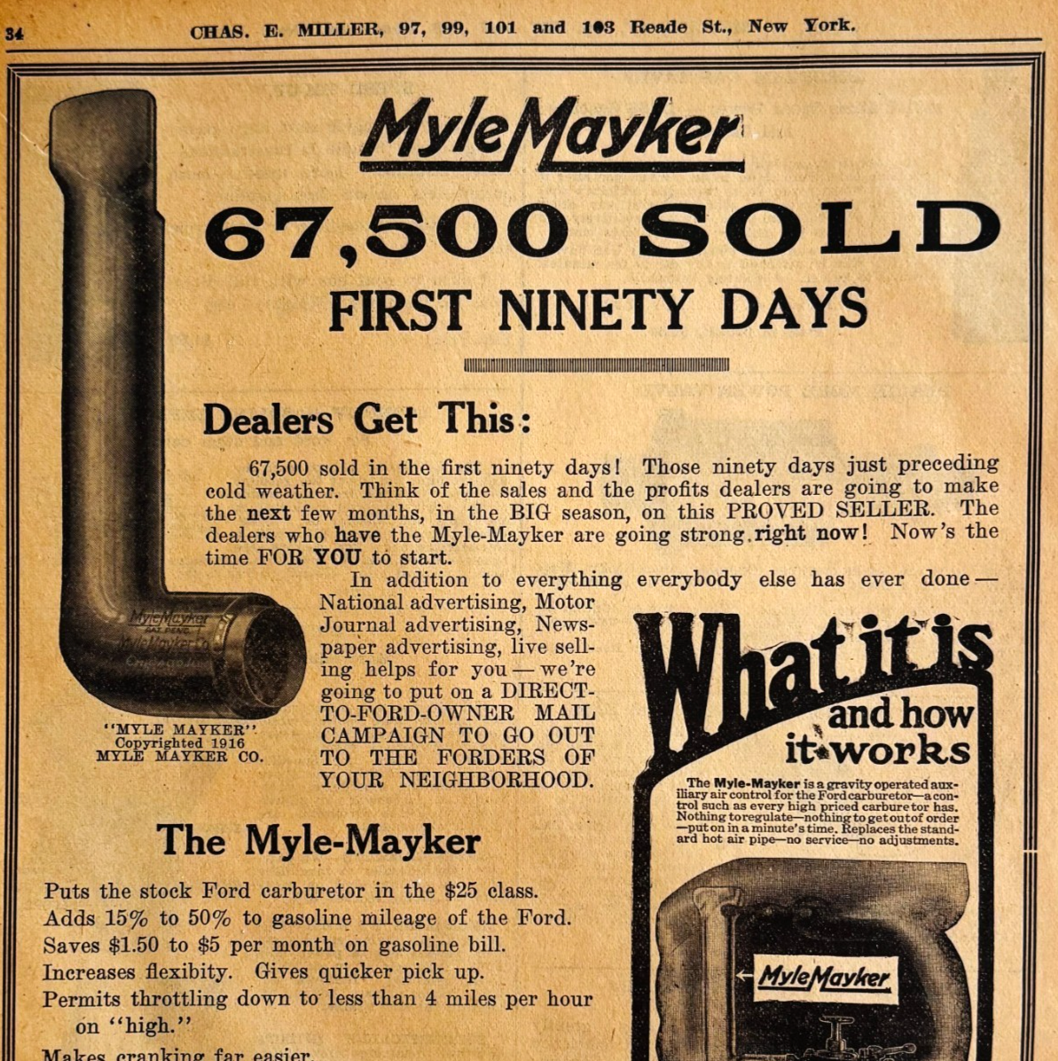 - 1917 Myle Mayker For Ford Carburetor Advertisement Chas Miller Automobilia F15A