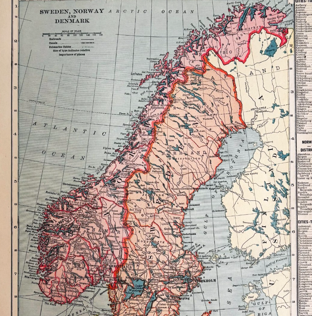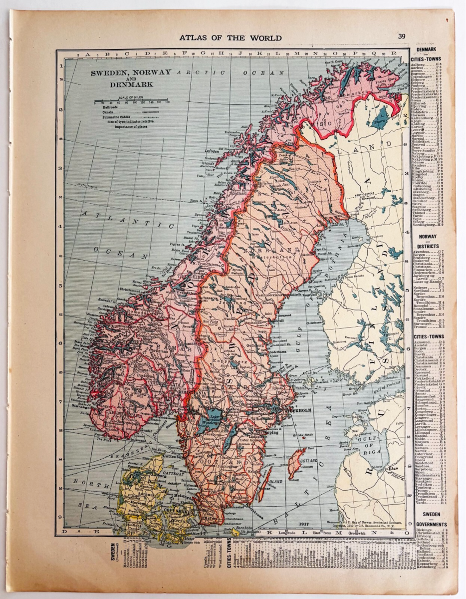 - 1917 Norway Sweden Denmark Map Atlas Of The World WW1 Era Scandinavia DWUU1B