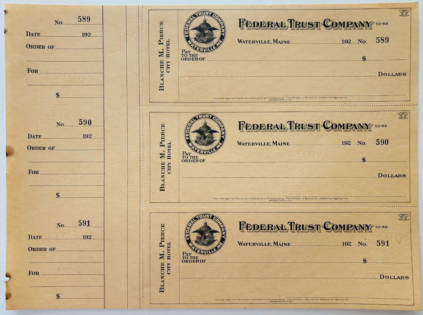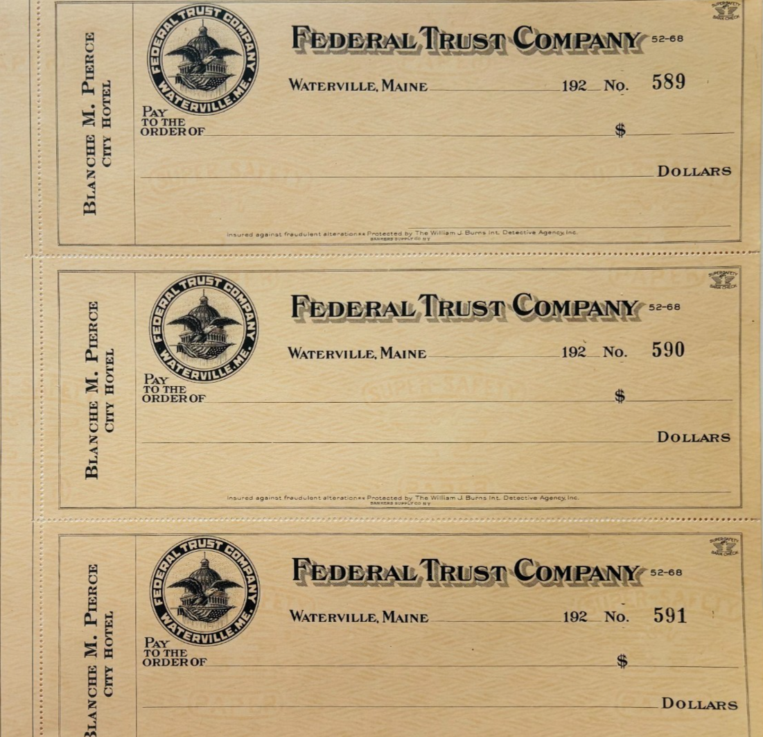 1920 Federal Trust Checks Lot of 3 City Hotel Waterville Maine 589-591 F18C1