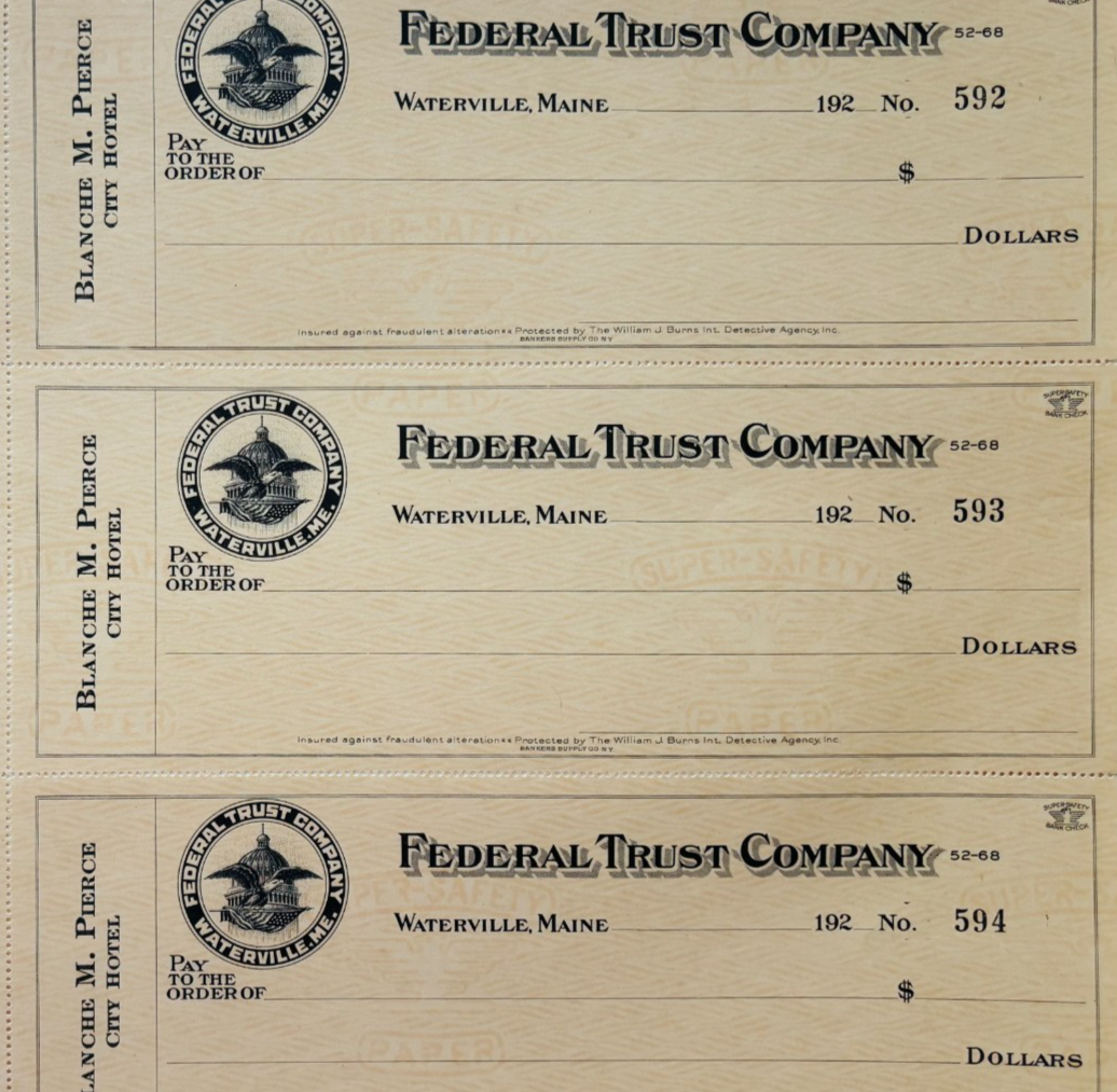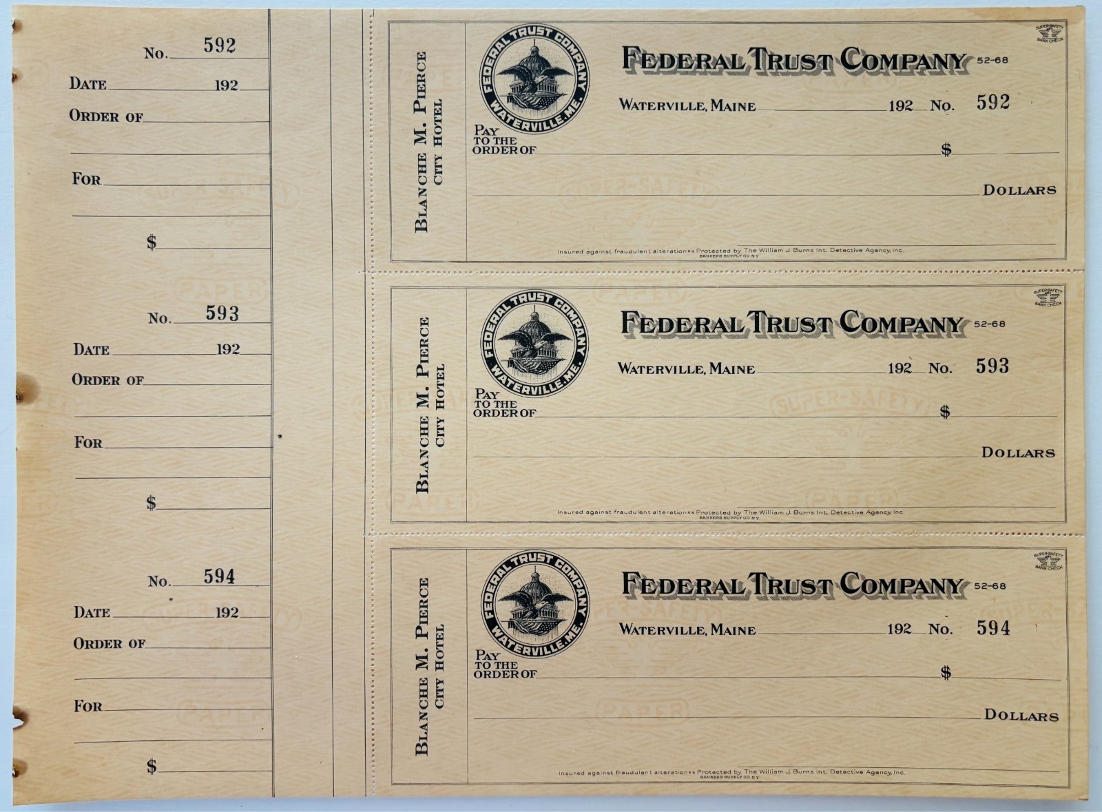 1920 Federal Trust Checks Lot of 3 City Hotel Waterville Maine 592-594 F18C1