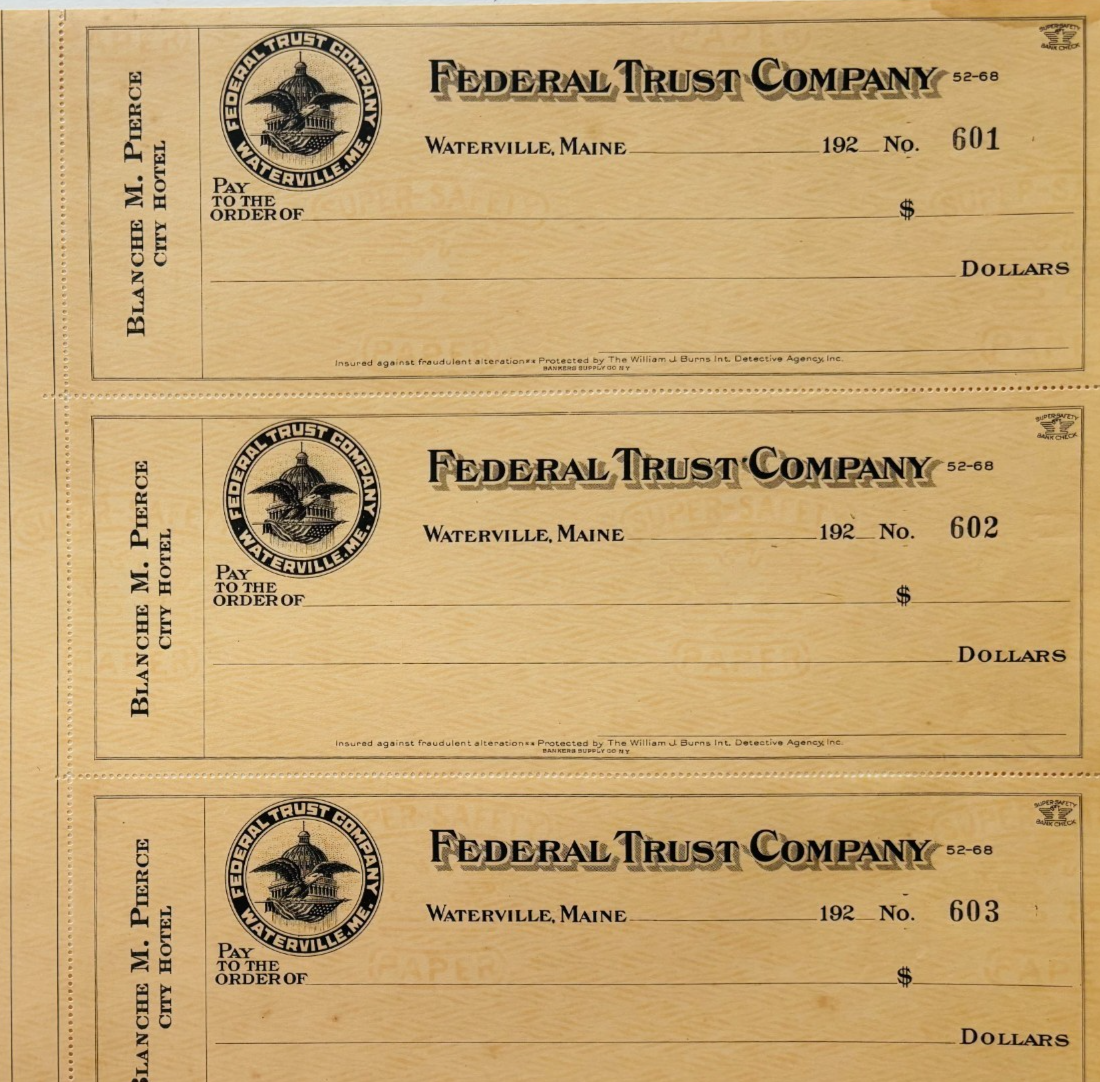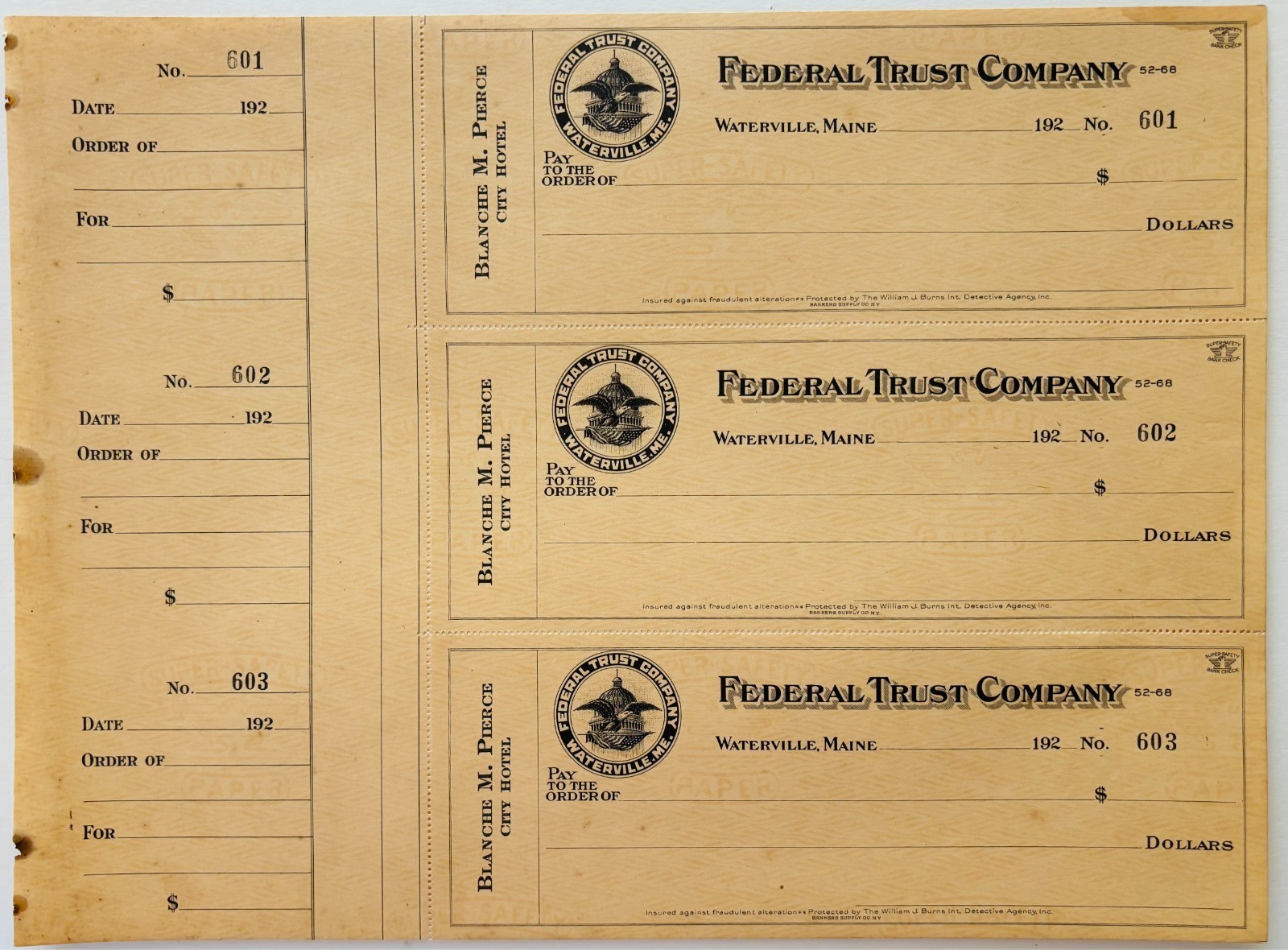 1920 Federal Trust Checks Lot of 3 City Hotel Waterville Maine 601-603 F18C1