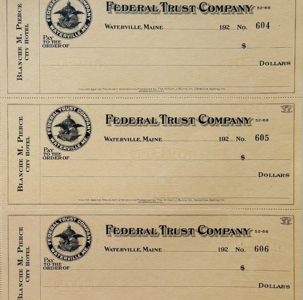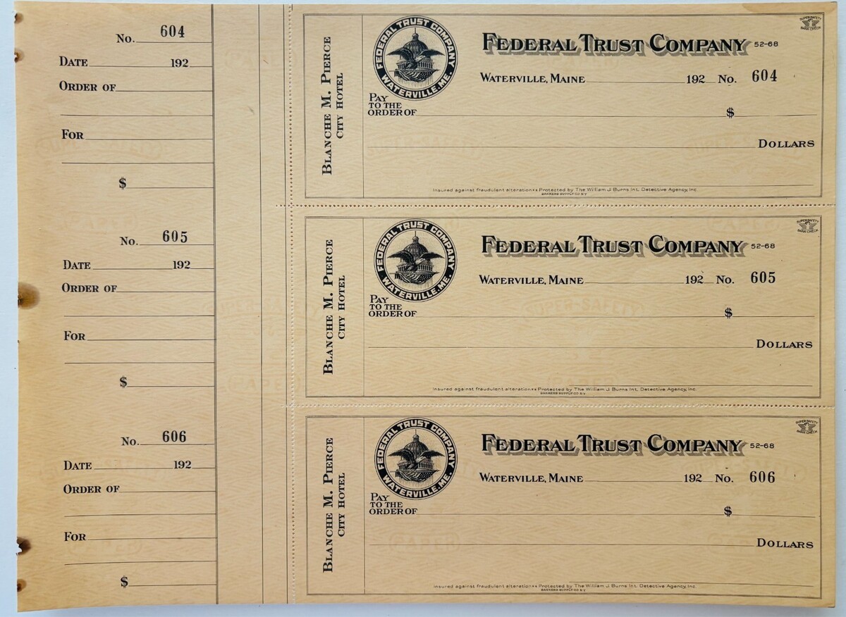 1920 Federal Trust Checks Lot of 3 City Hotel Waterville Maine 604-606 F18C1