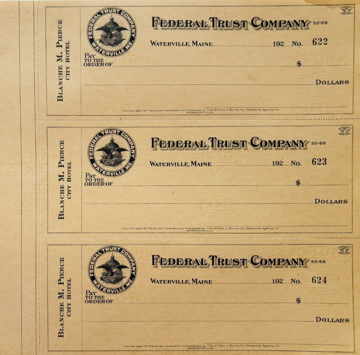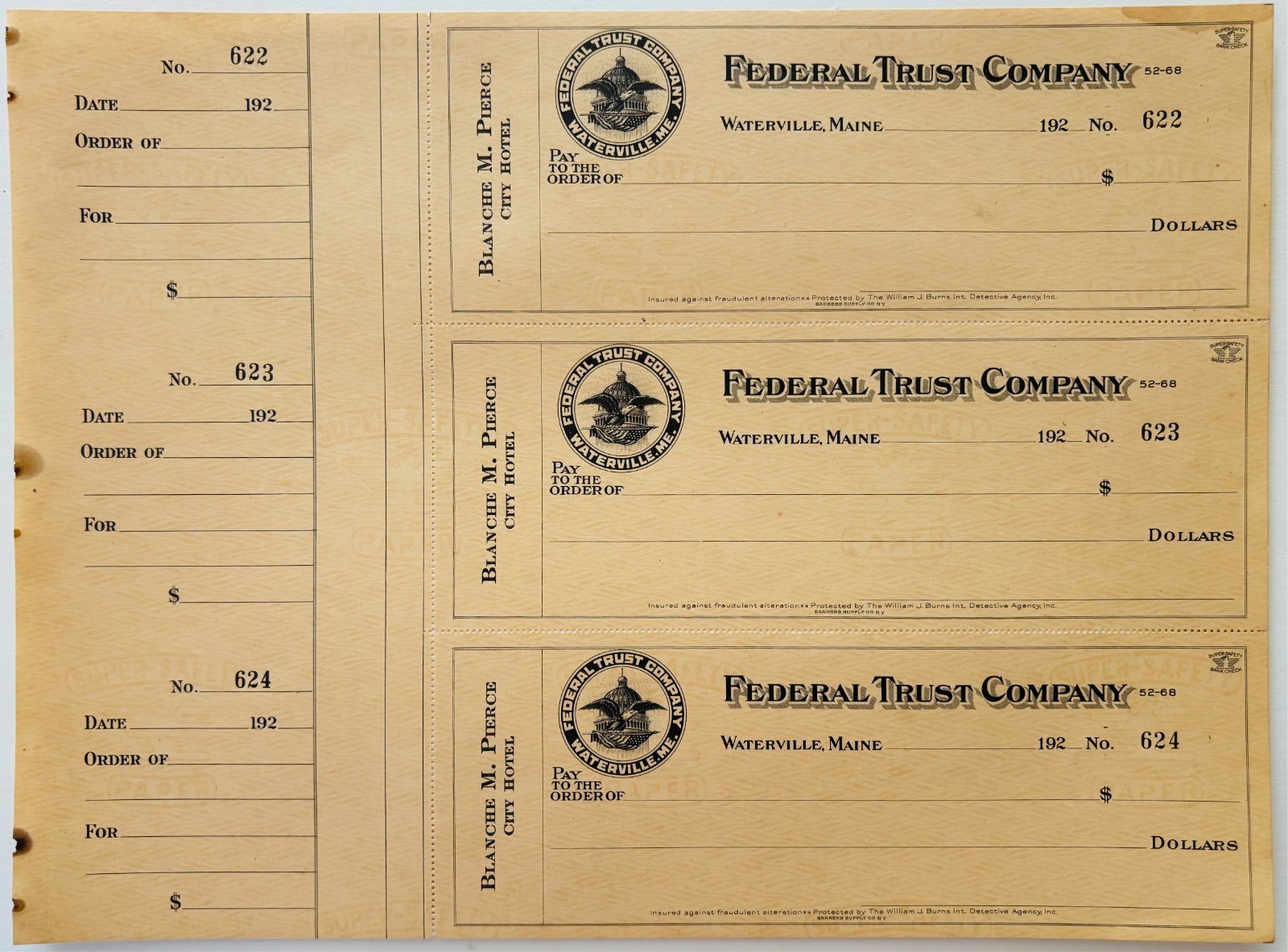 1920 Federal Trust Checks Lot of 3 City Hotel Waterville Maine 622-624 F18C1