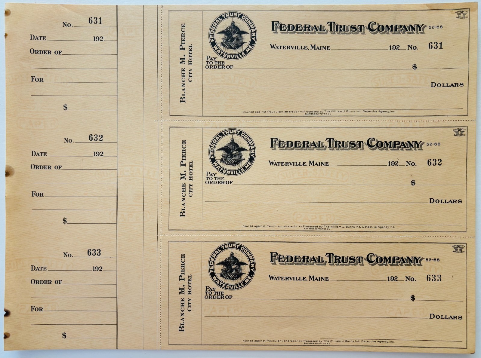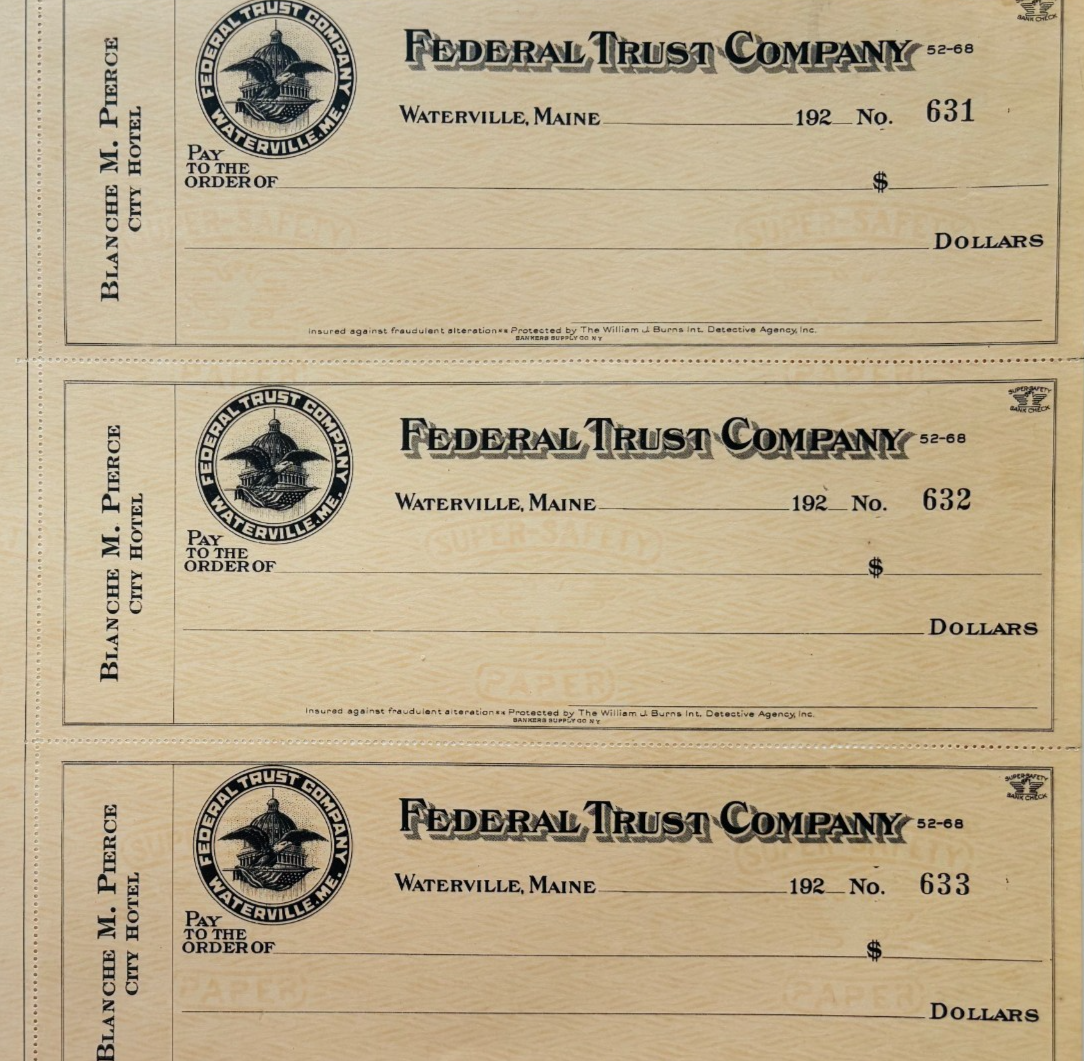 1920 Federal Trust Checks Lot of 3 City Hotel Waterville Maine 631-633 F18C1