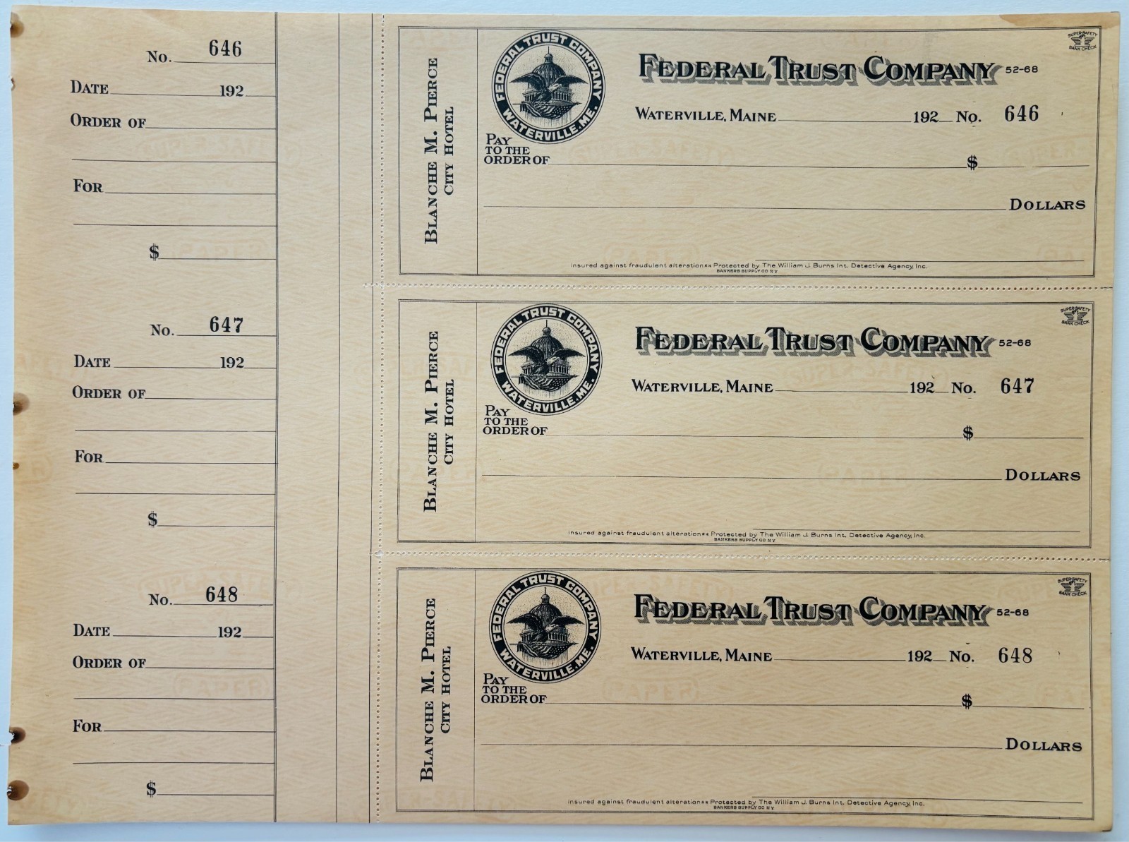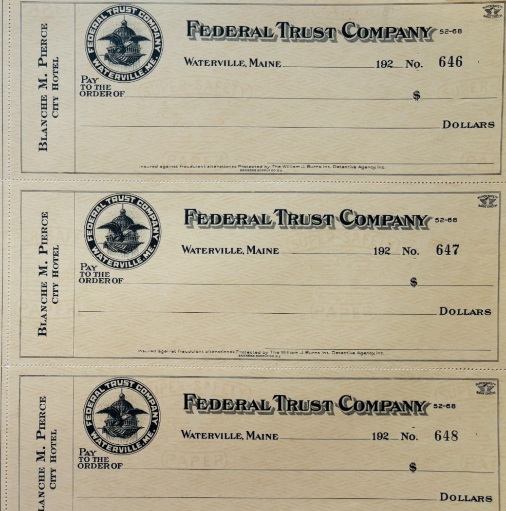 1920 Federal Trust Checks Lot of 3 City Hotel Waterville Maine 646-648 F18C2