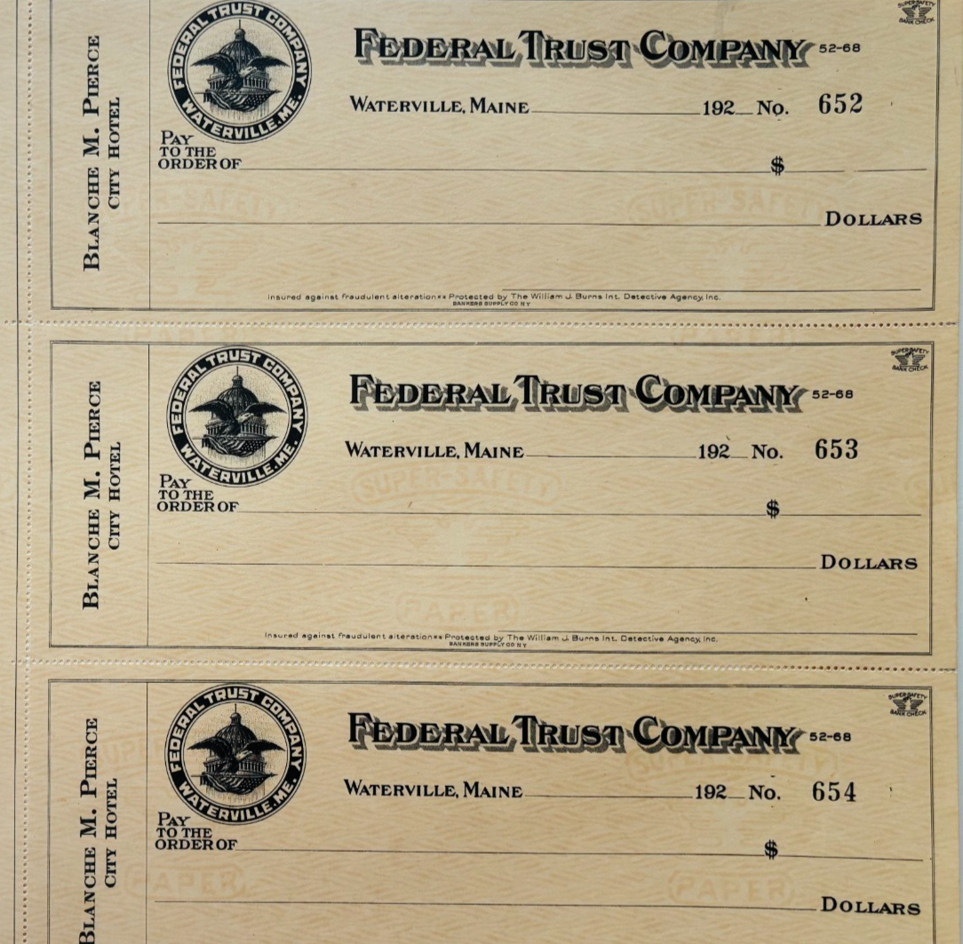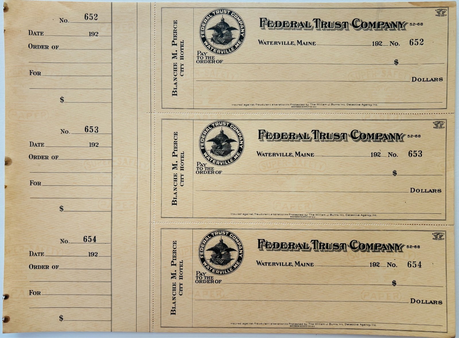 1920 Federal Trust Checks Lot of 3 City Hotel Waterville Maine 652-654 F18C2