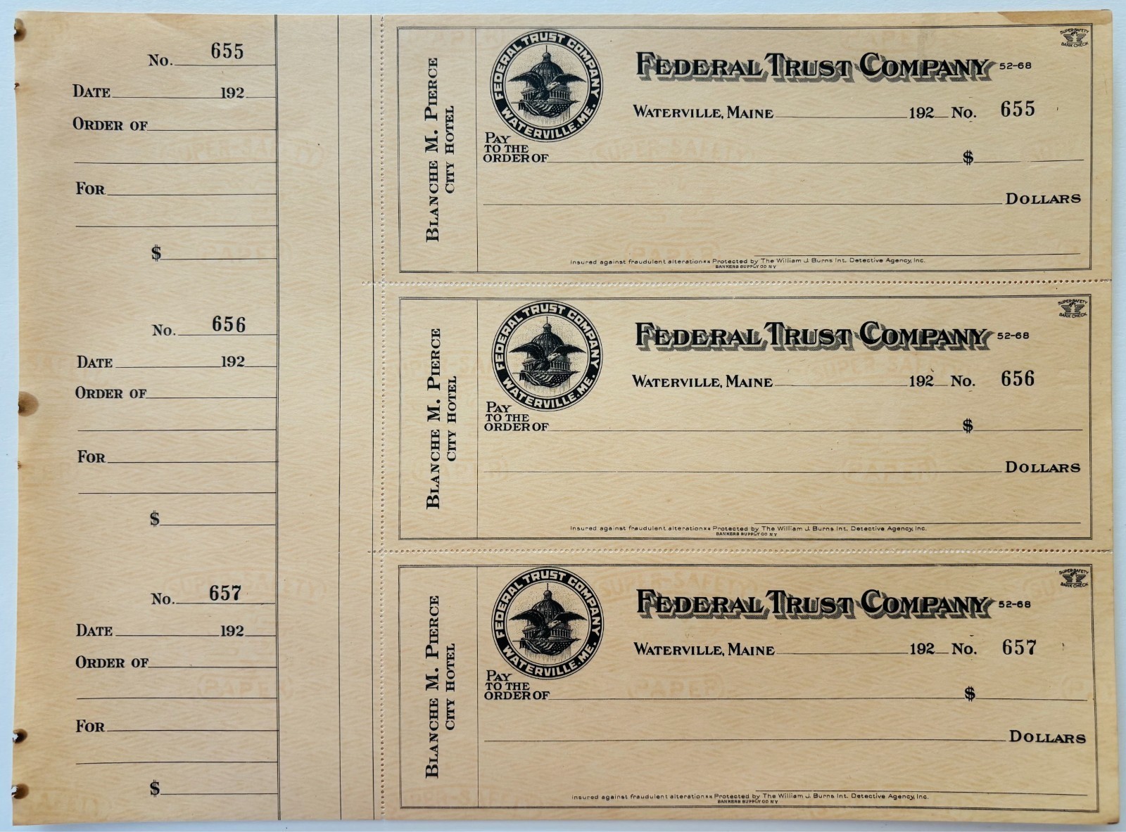 1920 Federal Trust Checks Lot of 3 City Hotel Waterville Maine 655-657 F18C2