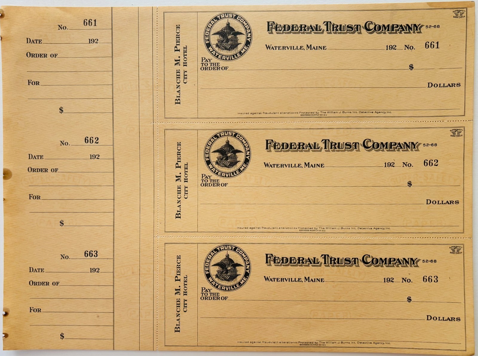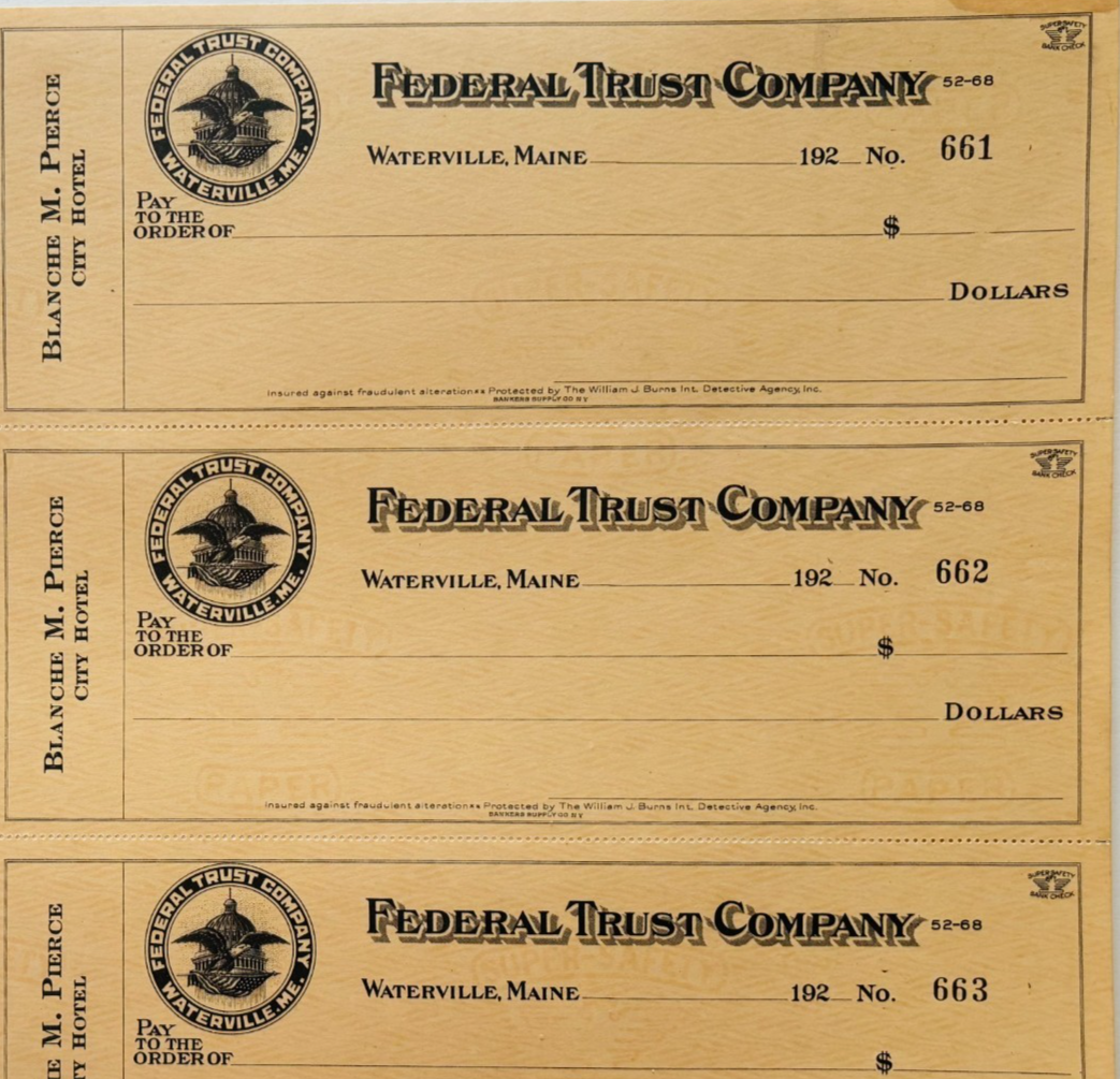 1920 Federal Trust Checks Lot of 3 City Hotel Waterville Maine 661-663 F18C1