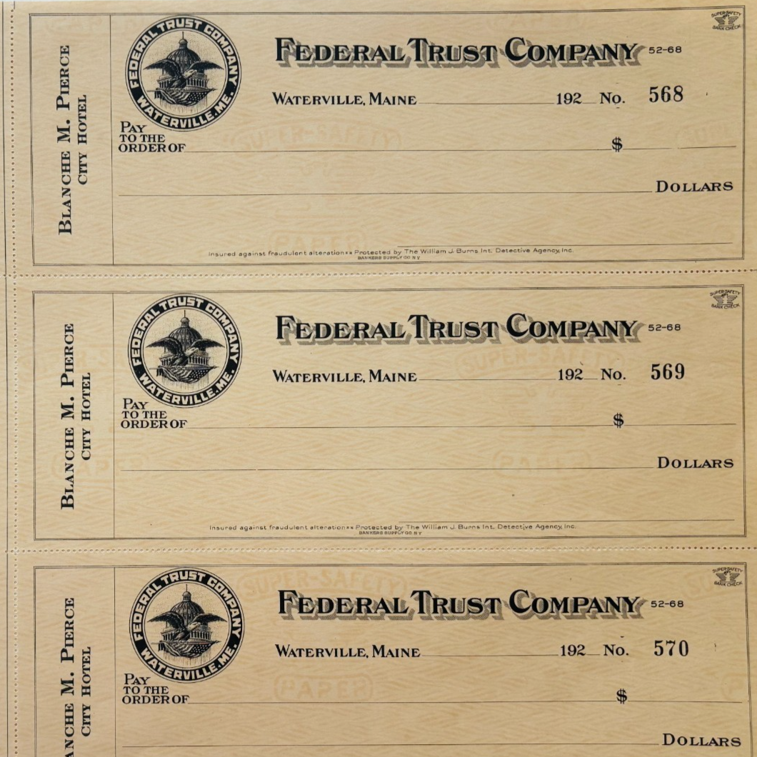 1920 Federal Trust Checks Lot of 3 City Hotel Waterville Maine 668-670 F18C2