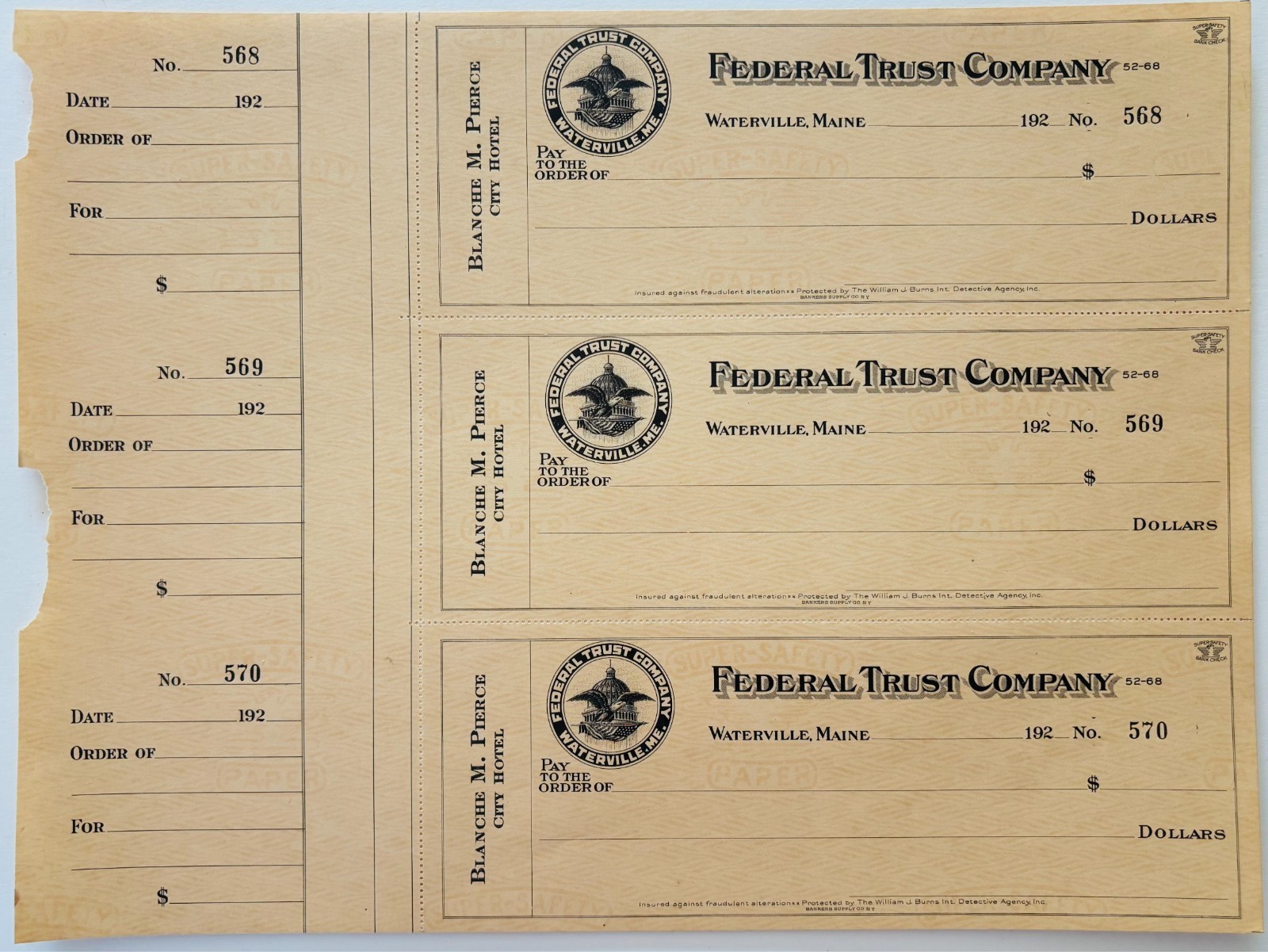 Lot of 3 still attached checks page for Blanche M. Pierce who resided at the City Hotel in Waterville, Maine