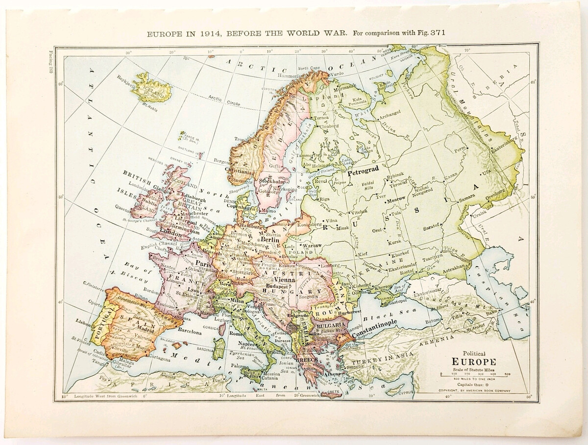 1920 Map Europe Before WW1 Italy German Empire Russia Spain France Hungary DWQ4