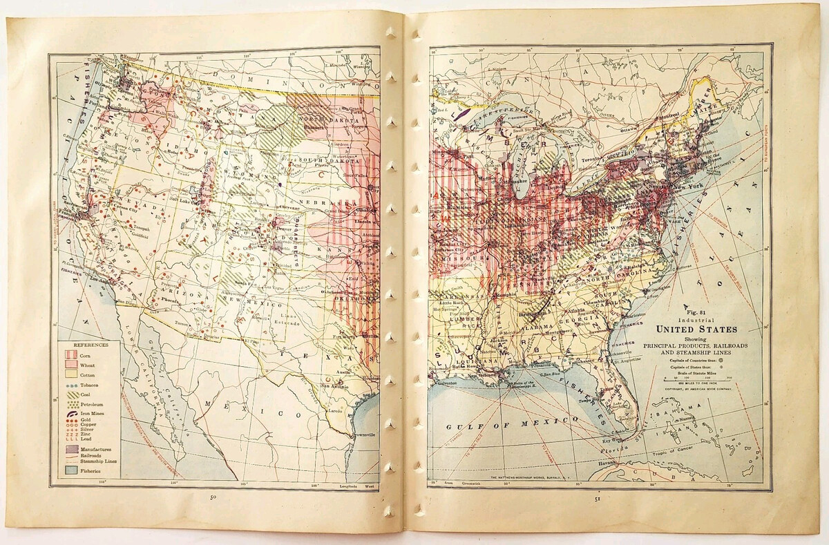 1920 United States Map Railroad Steamship Lines Centerfold Vintage USA DWQ6