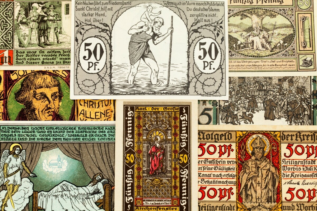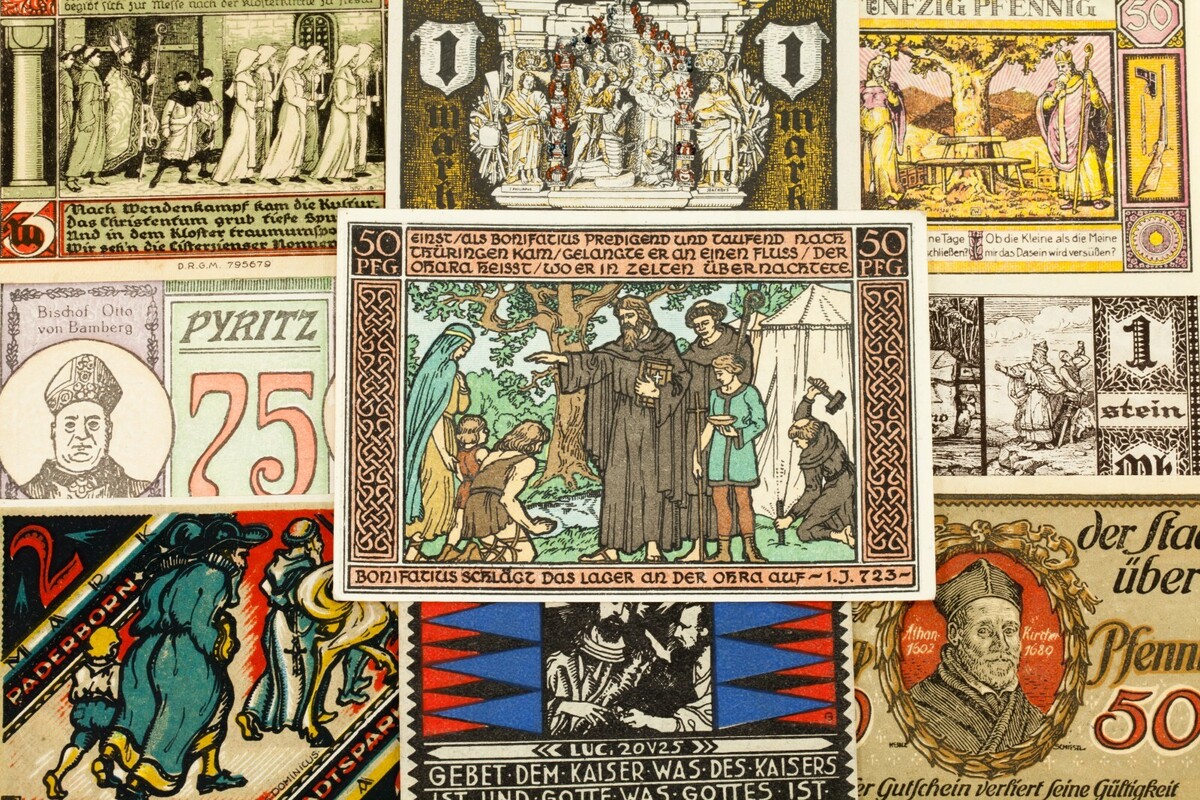 This lot will include 25 individual notgeld notes from Germany after World War I. All will be in Extra Fine to Uncirculated (XF-UNC) condition. Face values between 5 pfennig to 5 mark. Religious theme.