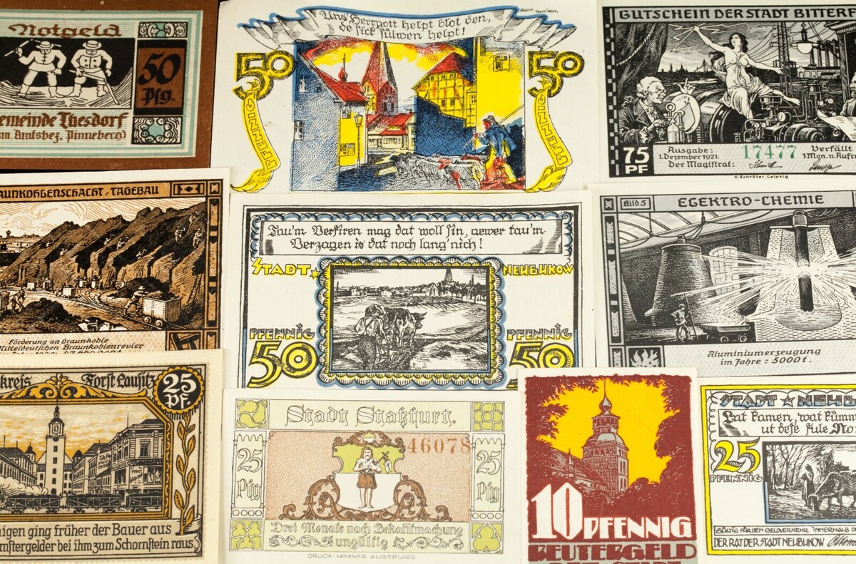 This lot will include 25 individual notgeld notes from Germany after World War I. All will be in Extra Fine to Uncirculated (XF-UNC) condition. Face values between 5 pfennig to 5 mark. Labor industry theme; factories, mines and farms.