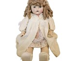 Genuine antique large sized bisque composition doll with soft torso. Blue eyes that open and close and has real eyelashes but they are broken off shorter on the left eye. 1920's styled blonde hair with bobby pins to hold the curls in place. Tiny open mouth, no teeth.