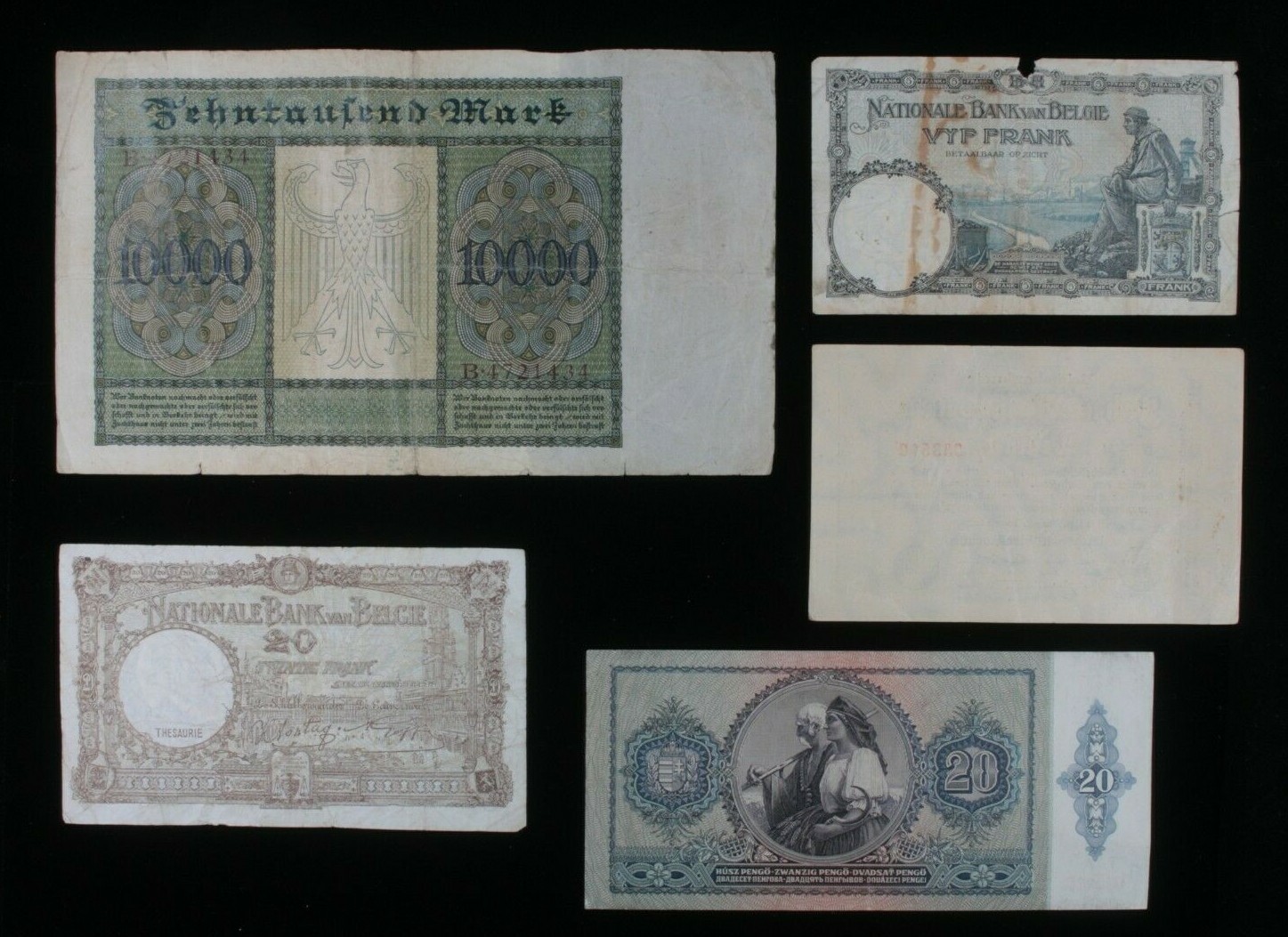 1922-1943 European 5-Note Currency Set Belgium, Germany & Hungary