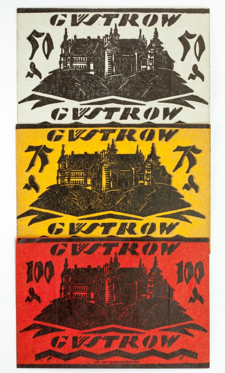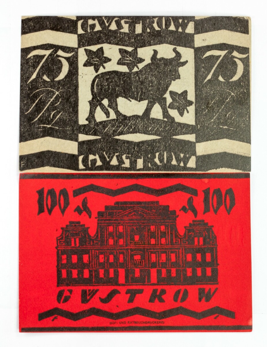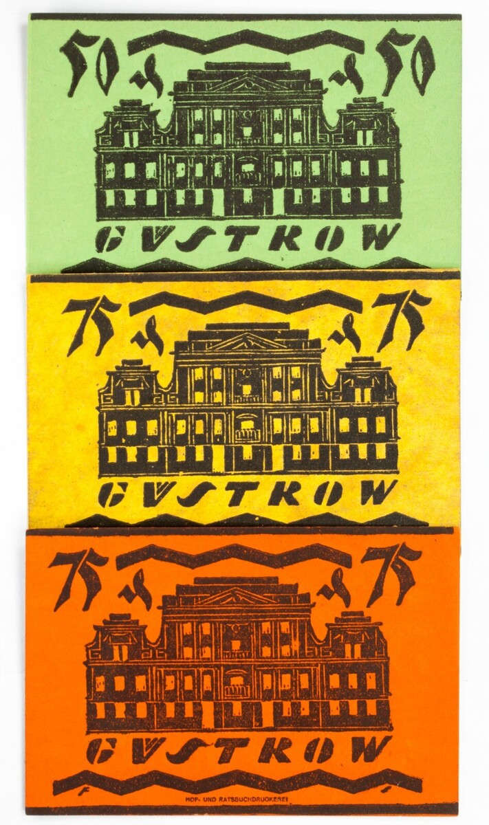 NOGELD (Deutsch für "Notgeld" oder "Notwendigkeitsgeld") bezieht sich auf Geld, das eine Institution in einer Zeit wirtschaftlicher oder politischer Krise herausgegeben hat. Die ausstellende Institution ist normalerweise eine ohne offizielle Sanktion der Zentralregierung. Dies geschieht, wenn staatlich produzierte Geld nicht von der Zentralbank verfügbar ist. Diese Notizen wurden von der Stadt Gustrow ausgestellt in Mecklenburg-vorpommern, Deutschland.