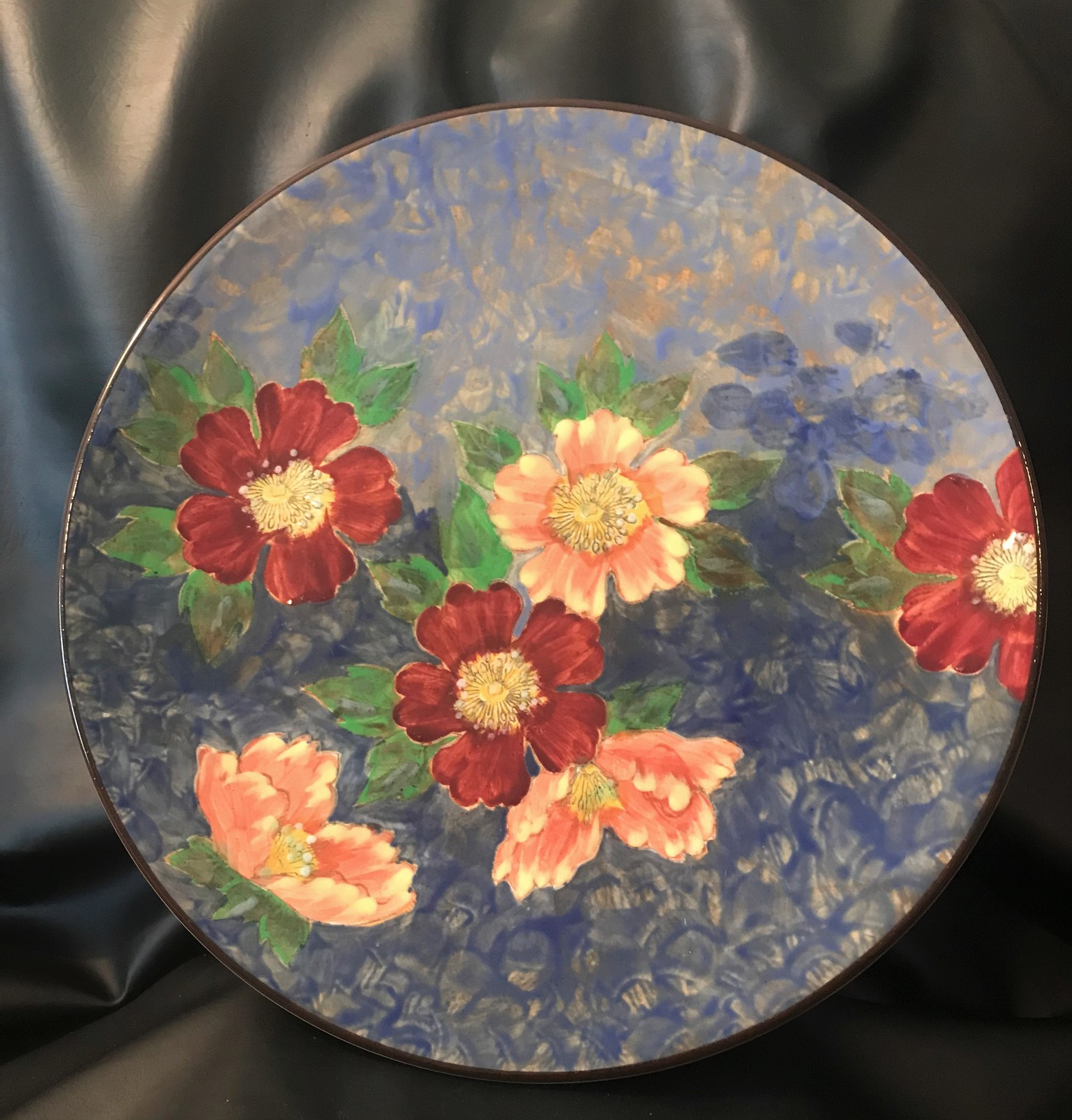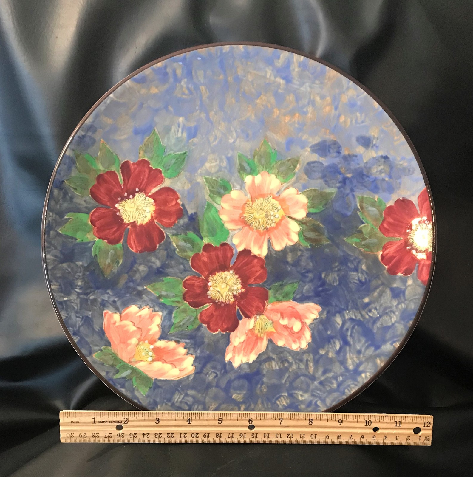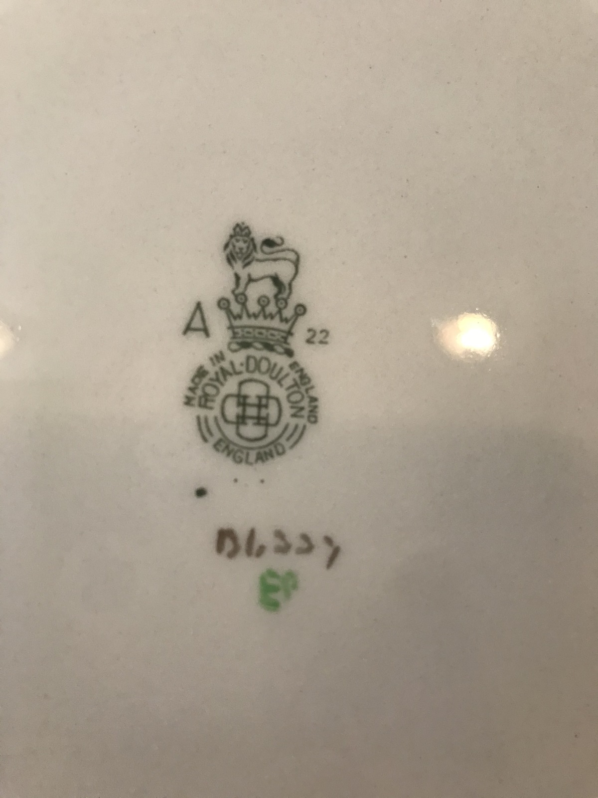 This 1922 Royal Daulton Charger is so beautiful with it's painted flowers it looks like a portion of a impressionist painting, amazing. As for it's age, we went to antique-hq dot Com and carefully studied their Royal Daulton insignia/Logo page and we found an absolute match. Also, we learned that the A on the left of the insignia means approved and on the right the 22 refers to its year, 1922. In addition, there's a product name and number under the insignia. This piece measures a tad over thirteen inches.