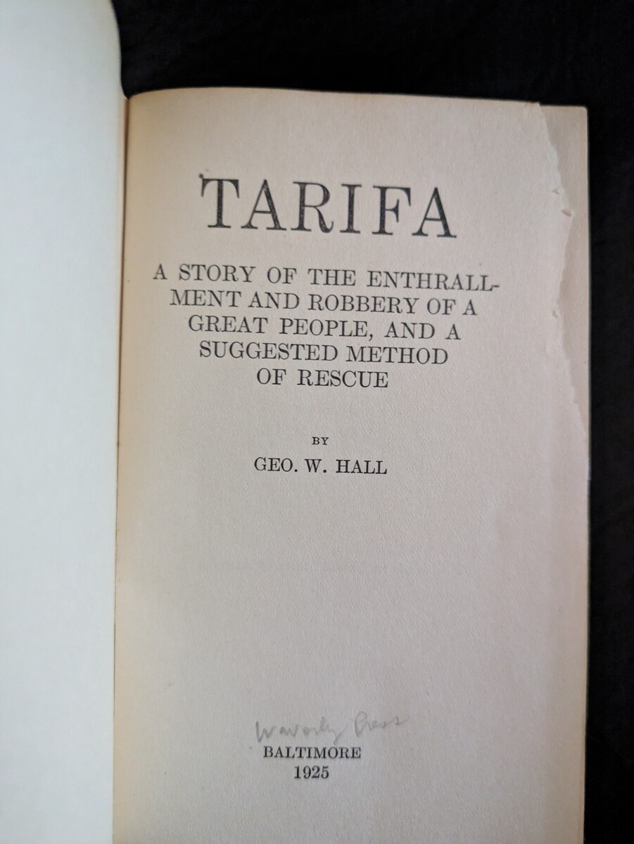 Le produit est un roman a couverture rigide intitule « Tarifa Une histoire de captivite et de vol d'un grand peuple, et une methode de sauvetage suggeree" de l'auteur George Hall, publie par Waverly Press en 1925. Le livre s?inscrit dans le genre de la fiction et se deroule dans les annees 1920. Le recit s'articule autour de themes d'interet general et est ecrit en anglais. Le livre n'est pas signe, marque comme ex libris ou personnalise de quelque maniere que ce soit, ce qui le rend ideal pour les lecteurs a la recherche d'un morceau de litterature vintage ou classique a apprecier.