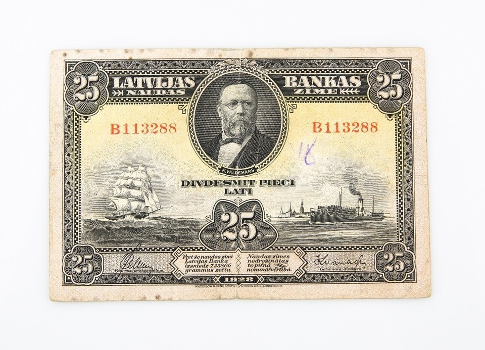 Obverse features a portrait of Valdemars and two ocean-going ships