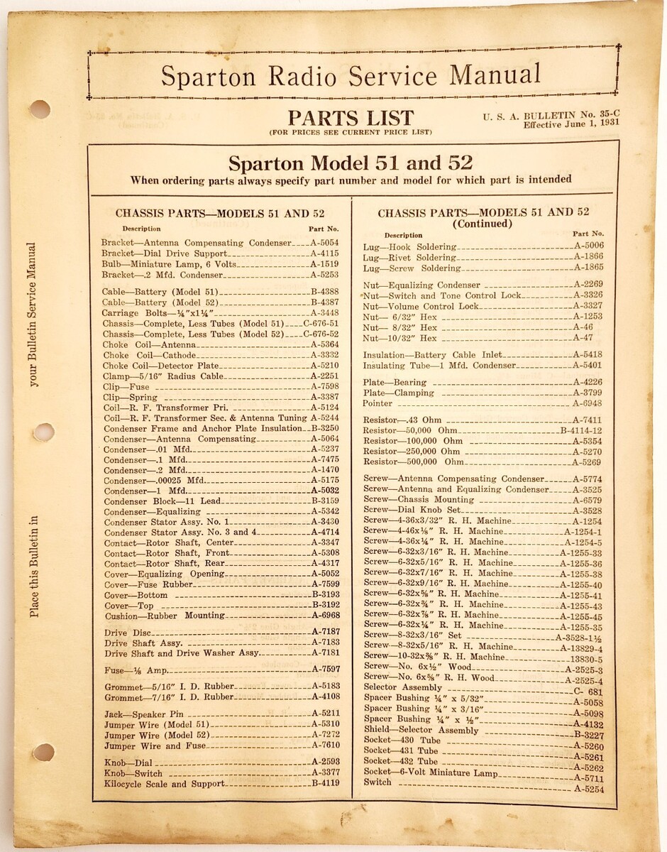 - 1931 Sparton Radio Model 51 And 52 Parts List Electronics Ephemera F20A