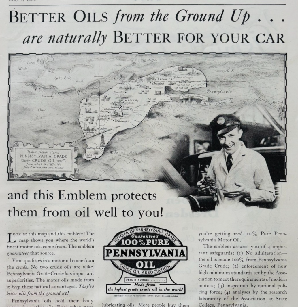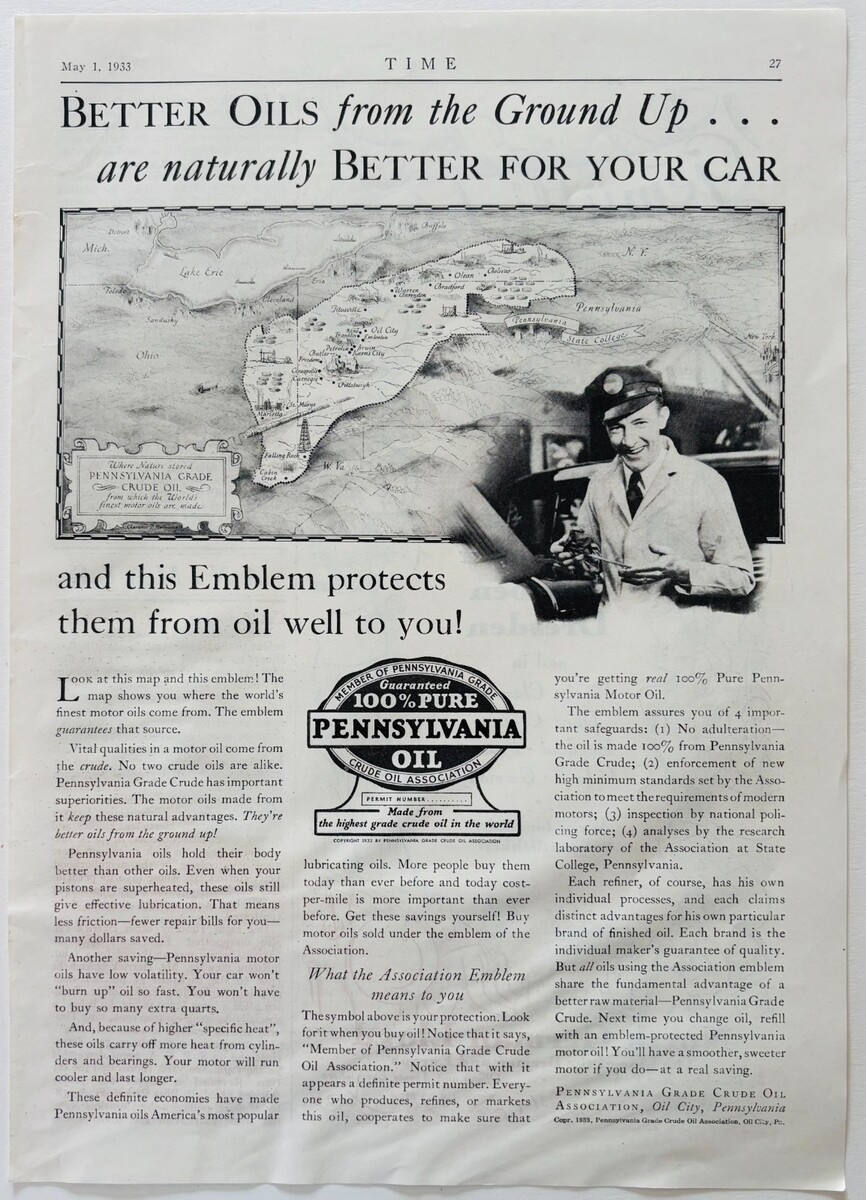 - 1933 Pennsylvania Oil City Motor Oil Advertisement Automobilia Supply F18B1