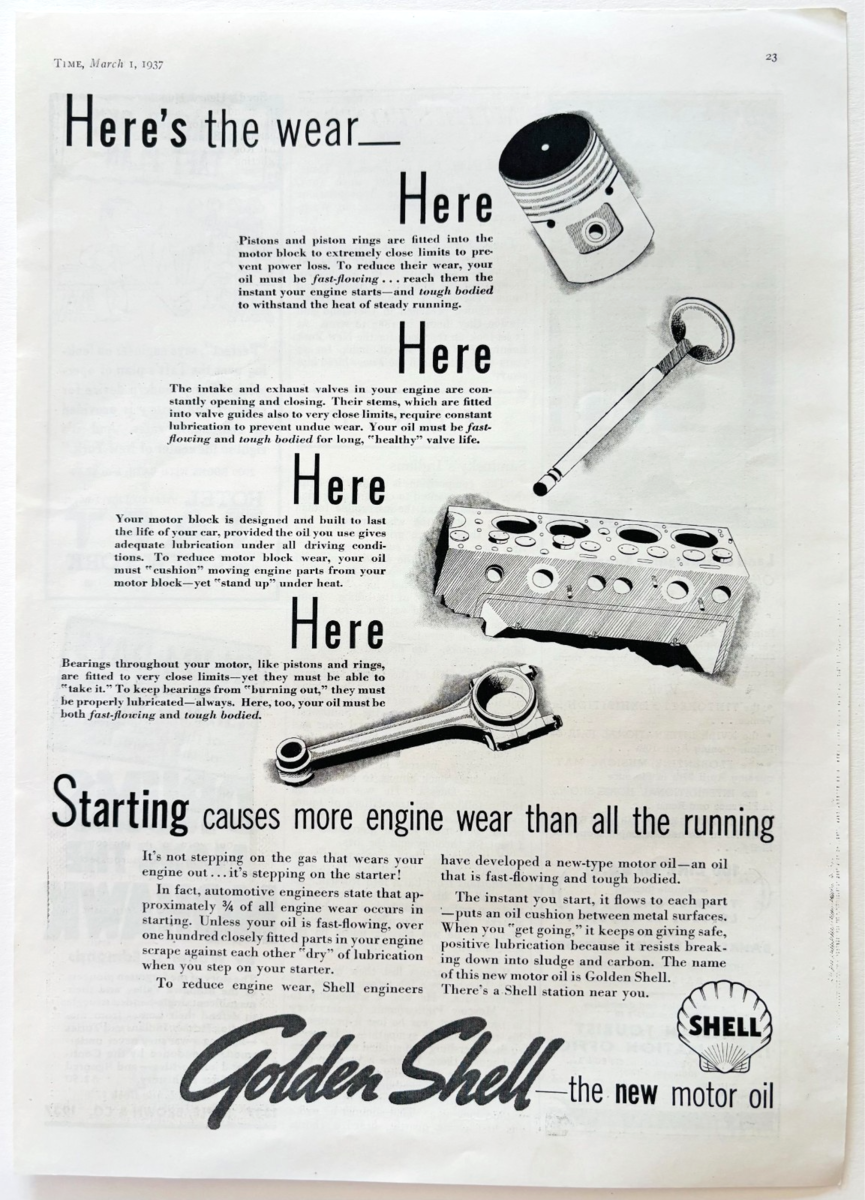 1937 Shell Gasoline & Oil Advertisement Automobilia Golden Motor Oil E90E1