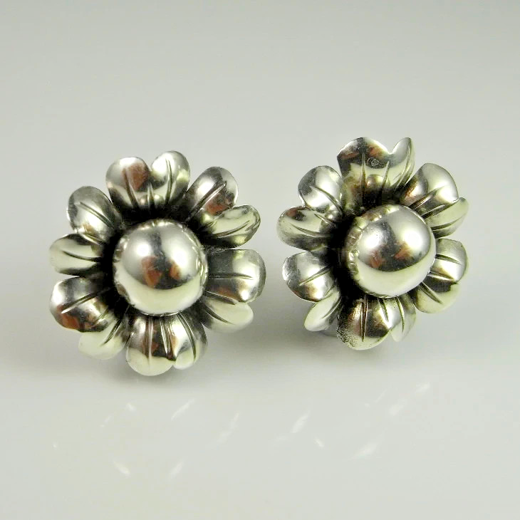 - 1940s Silver Rose Daisy Flower Handmade Screw On Earrings Non Pierced