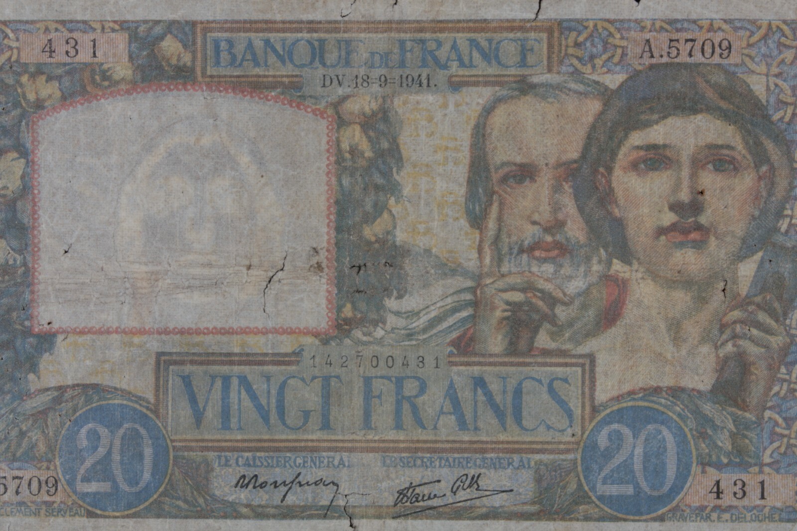 1941 France 20 francs note // Science et Travail // Banque de France (P # 92B.9)