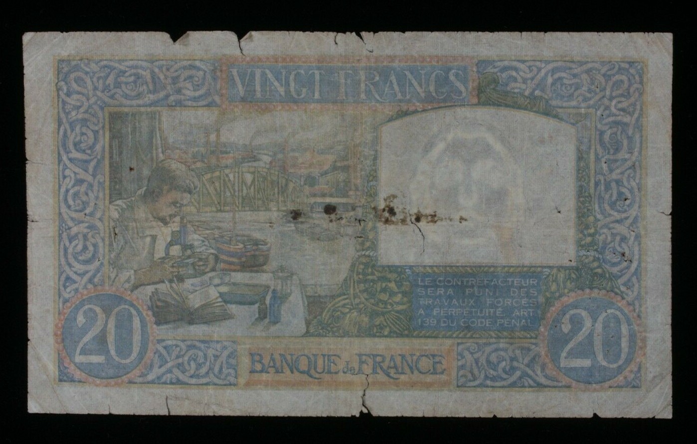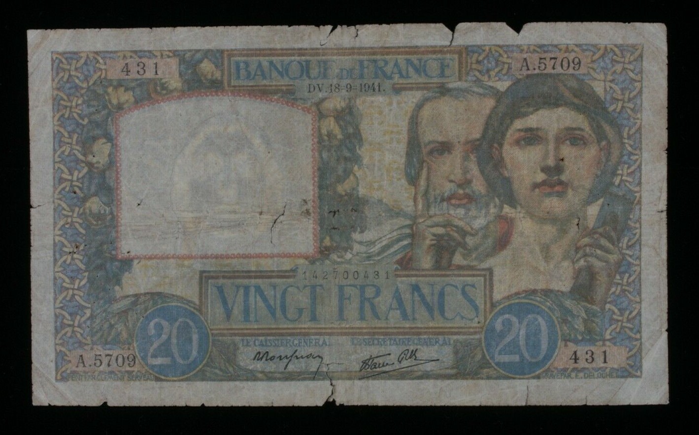 - 1941 France 20 Francs Note Science et Travail Banque de France (P#92b.9)