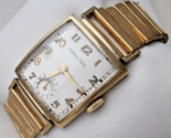 The product is a vintage Hamilton Watch Co. men's wristwatch from the 1940s, featuring a classic design with gold filled case and bezel. With a mechanical (manual) movement and 19 jewels, this analog watch also has a 12-hour dial and a rectangle shape. The brand's reputation for quality and reliability is highlighted by this timeless piece that is sure to appeal to collectors and watch enthusiasts looking for a piece with historical significance and a touch of luxury.