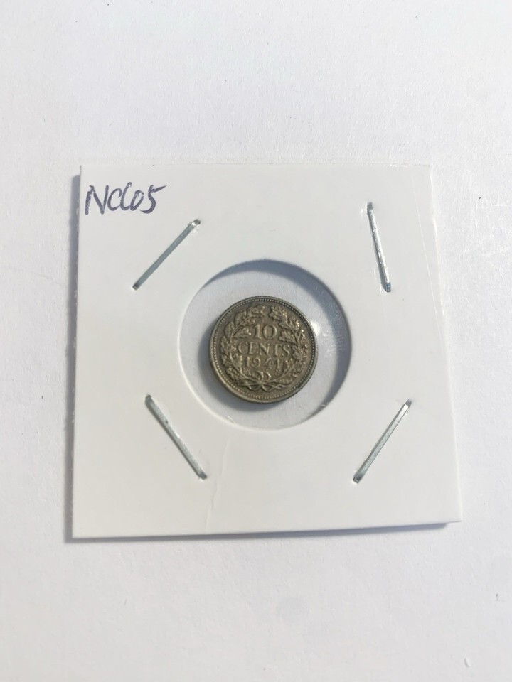 - 1941 Netherlands silver 10 cents, Wilhelmina I, KM-163 High Grade