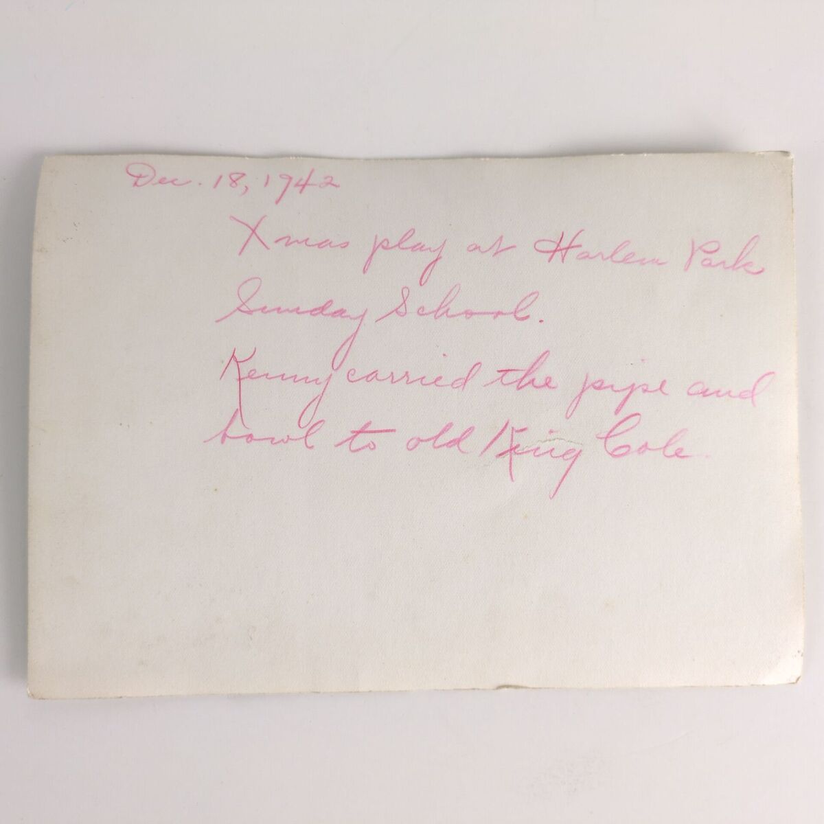 The text on the back reads "Dec 18, 1942. Xmas play at Harlem Park Sunday School. Kenny carried the pipe and bowl to old King Cole".