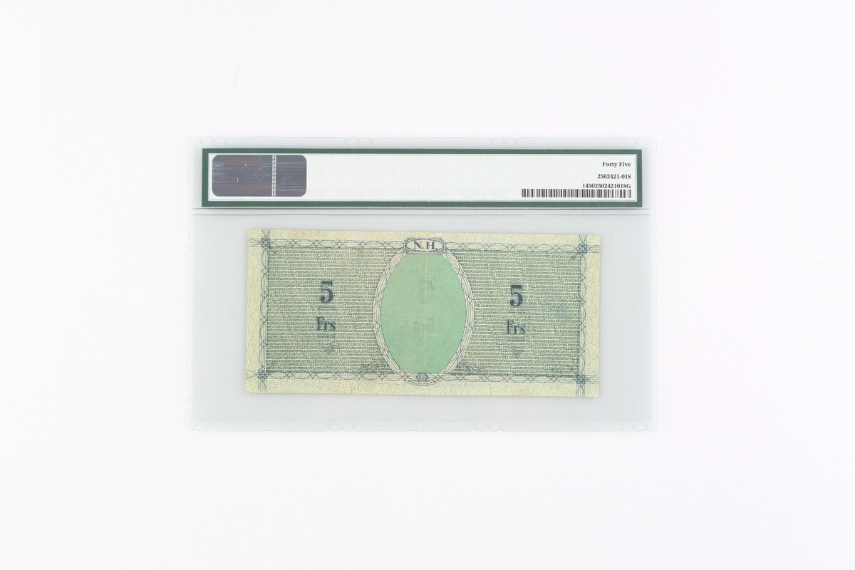 Sellado en un titular de PMG con el título "Nuevo problema de hebrides / emergencia - WWII // elige# 1 ND (1943) 5 Franc // s / n 01673 - Servicios Nationalux Francais"