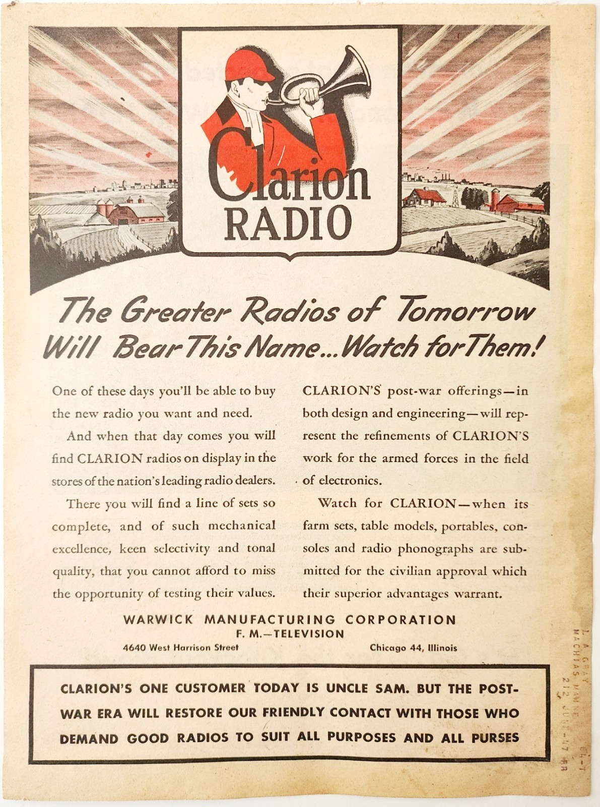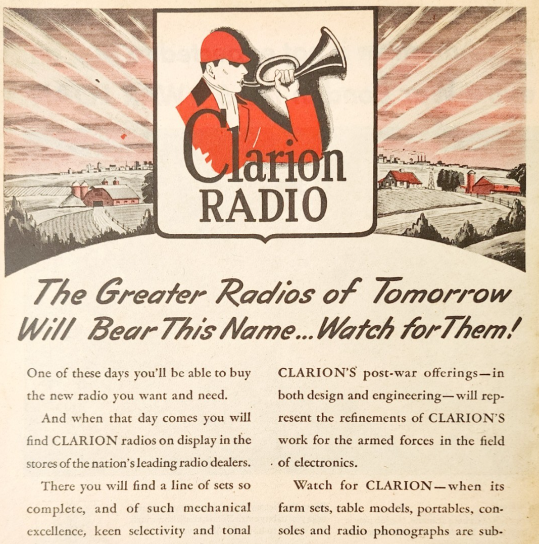 - 1944 Clarion Radio Company Advertisement WW2 Era Communication Post War DWP7B