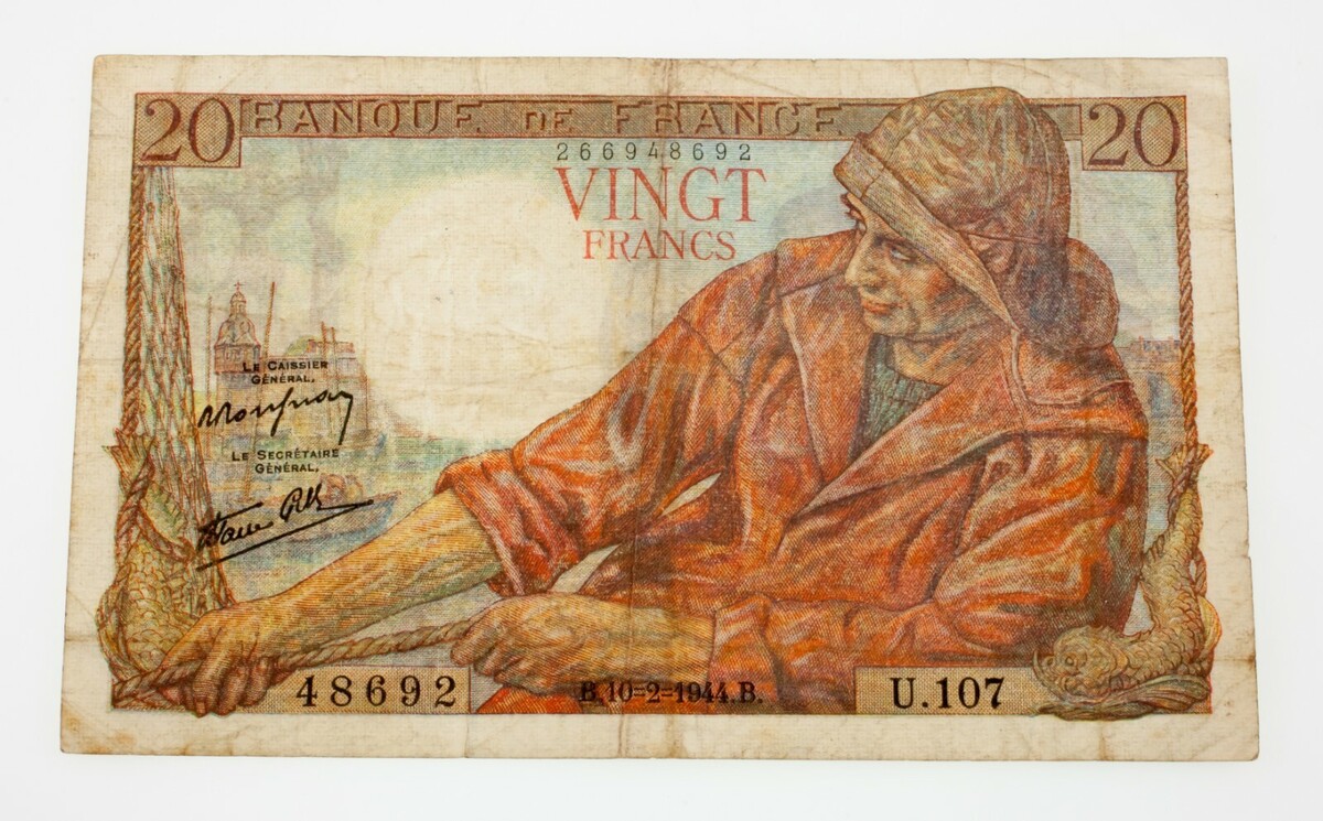 - 1944 France 20 Francs Note in Fine+ Condition Pick #100a