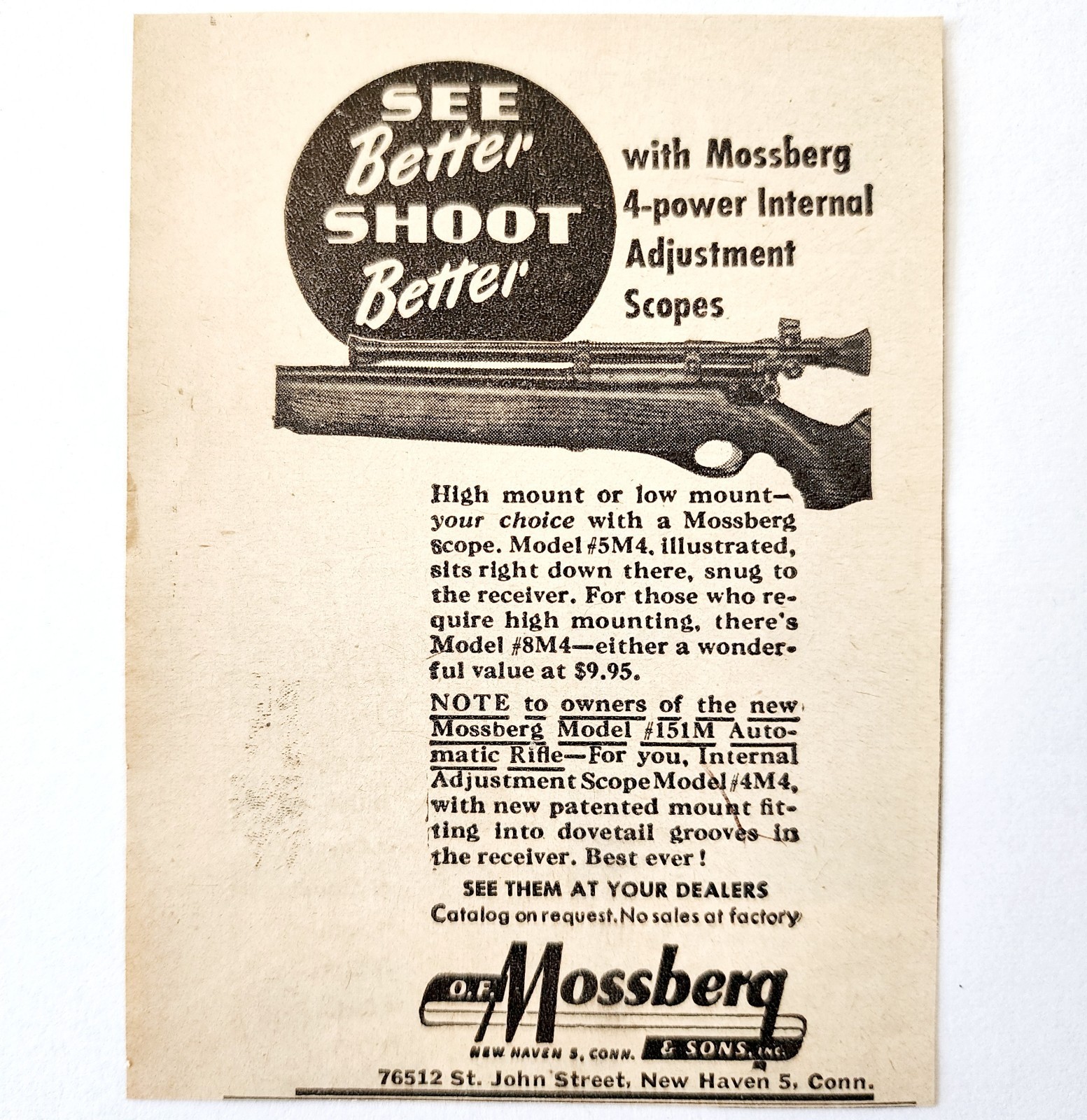 - 1947 Mossberg 4 Power Scope Advertisement Vintage Hunting Gun Optics E8H