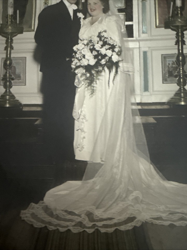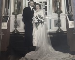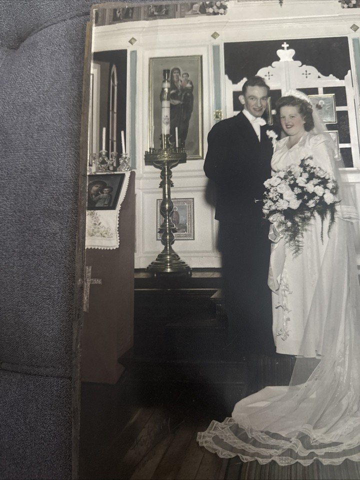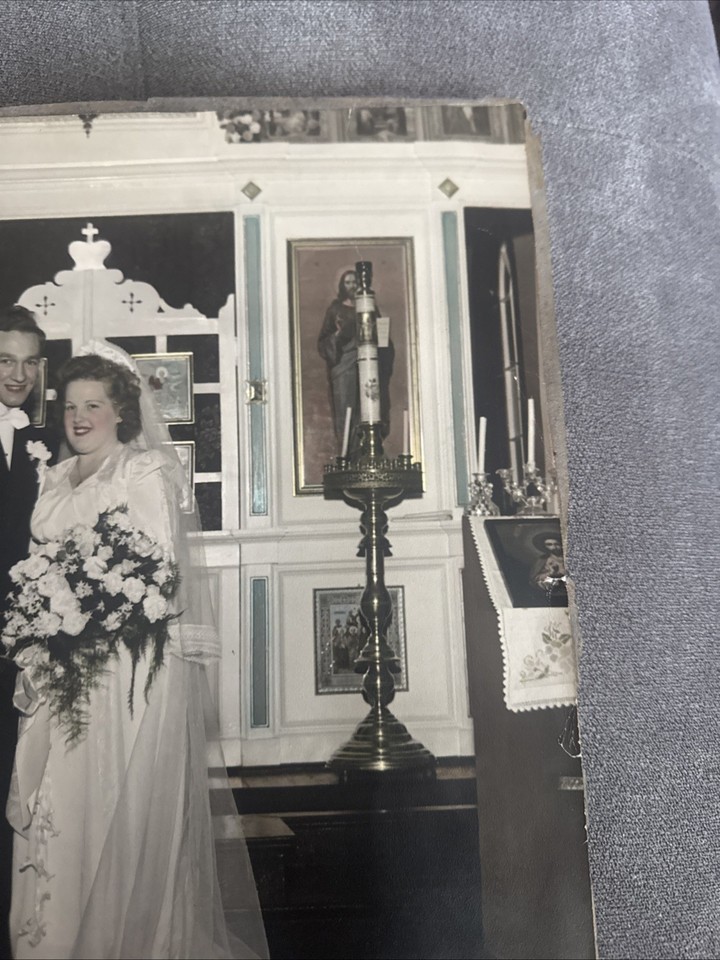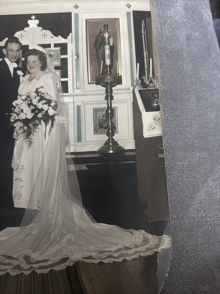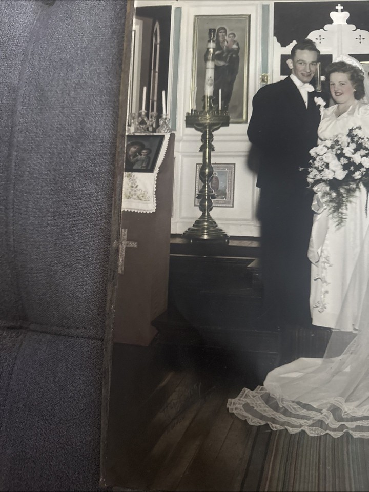 The product is a 1947 wedding couple portrait featuring a bride and groom in a Catholic church. The photograph captures a sentimental moment in time from the 1940s, showcasing a classic and timeless theme of love and marriage. With its vibrant color and original production, this piece of photographic history offers a glimpse into the past and preserves the beauty of a special day for a couple.