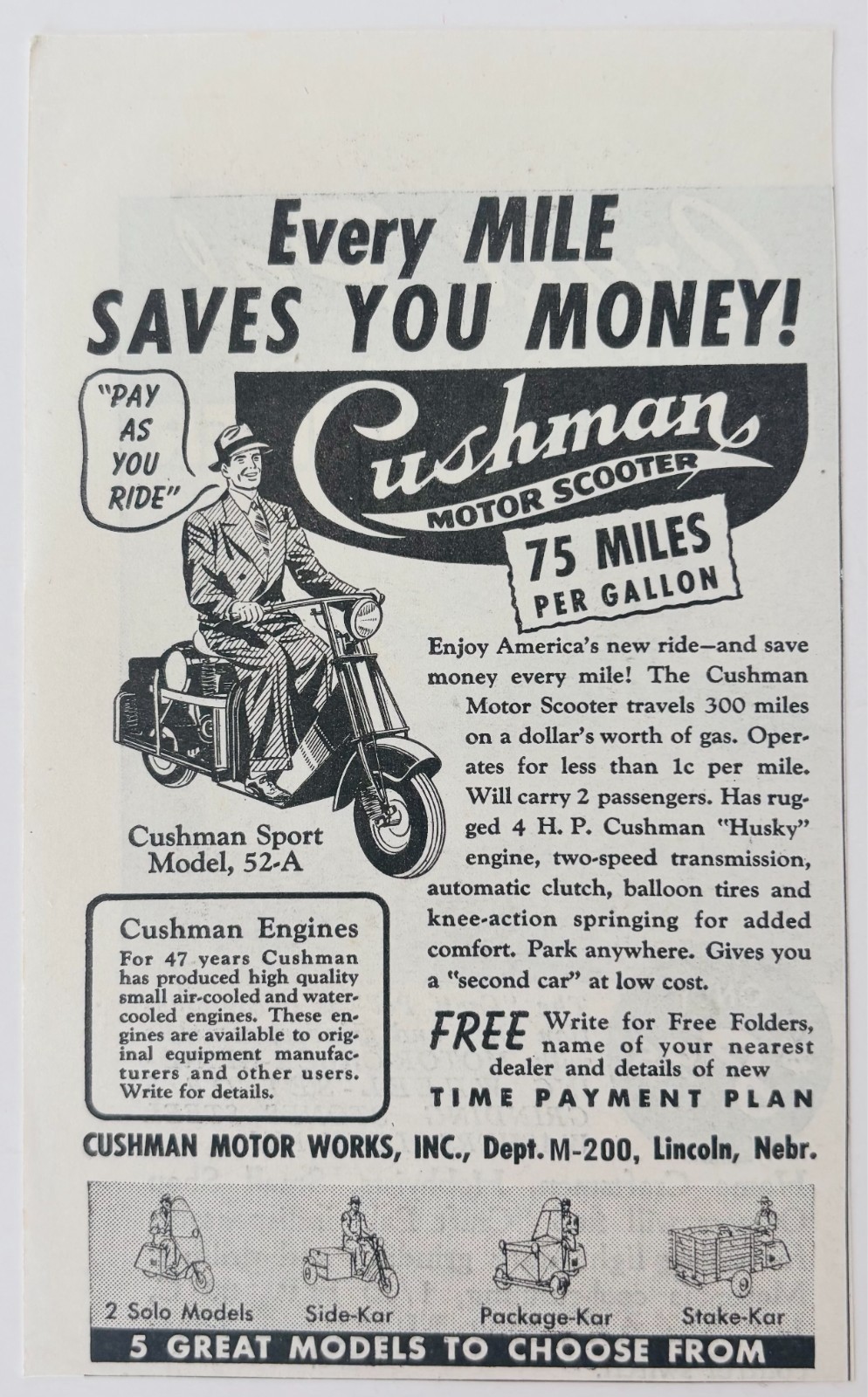 1948 Cushman Motor Scooter Advertisement Vintage Transportation Motorcycle F17K