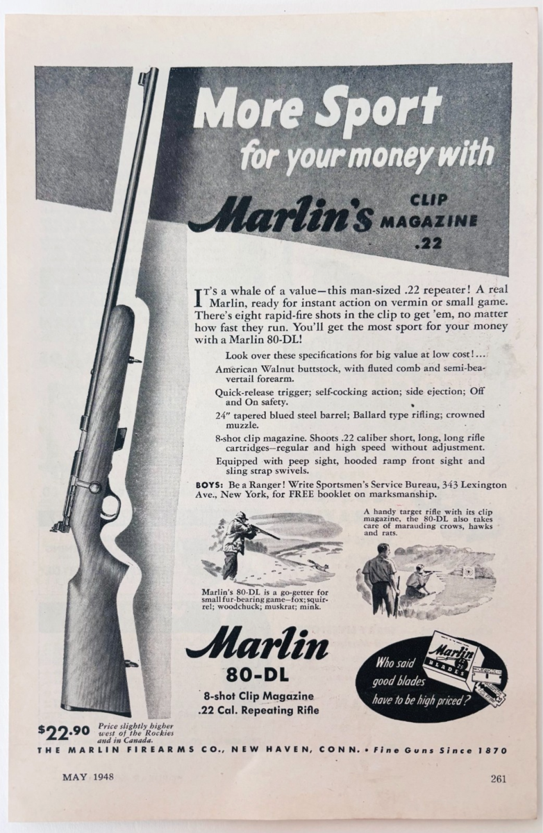 - 1948 Marlin 22 Model 80-DL Rifle Advertisement Firearms Guns Vintage F15T2