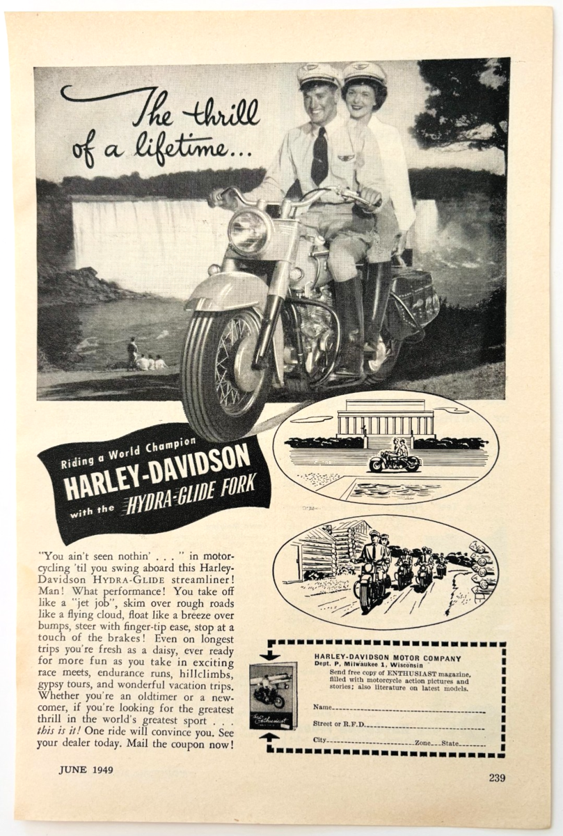 - 1949 Harley Davidson Motorcycle Advertisement Hydra Glide Forks Thrill DWU16A