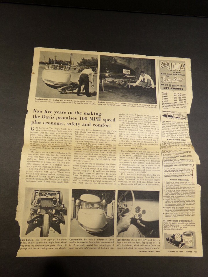 - 1949 Parade Magazine Page Davis Three Wheeler Car Article Burma Shave Ad