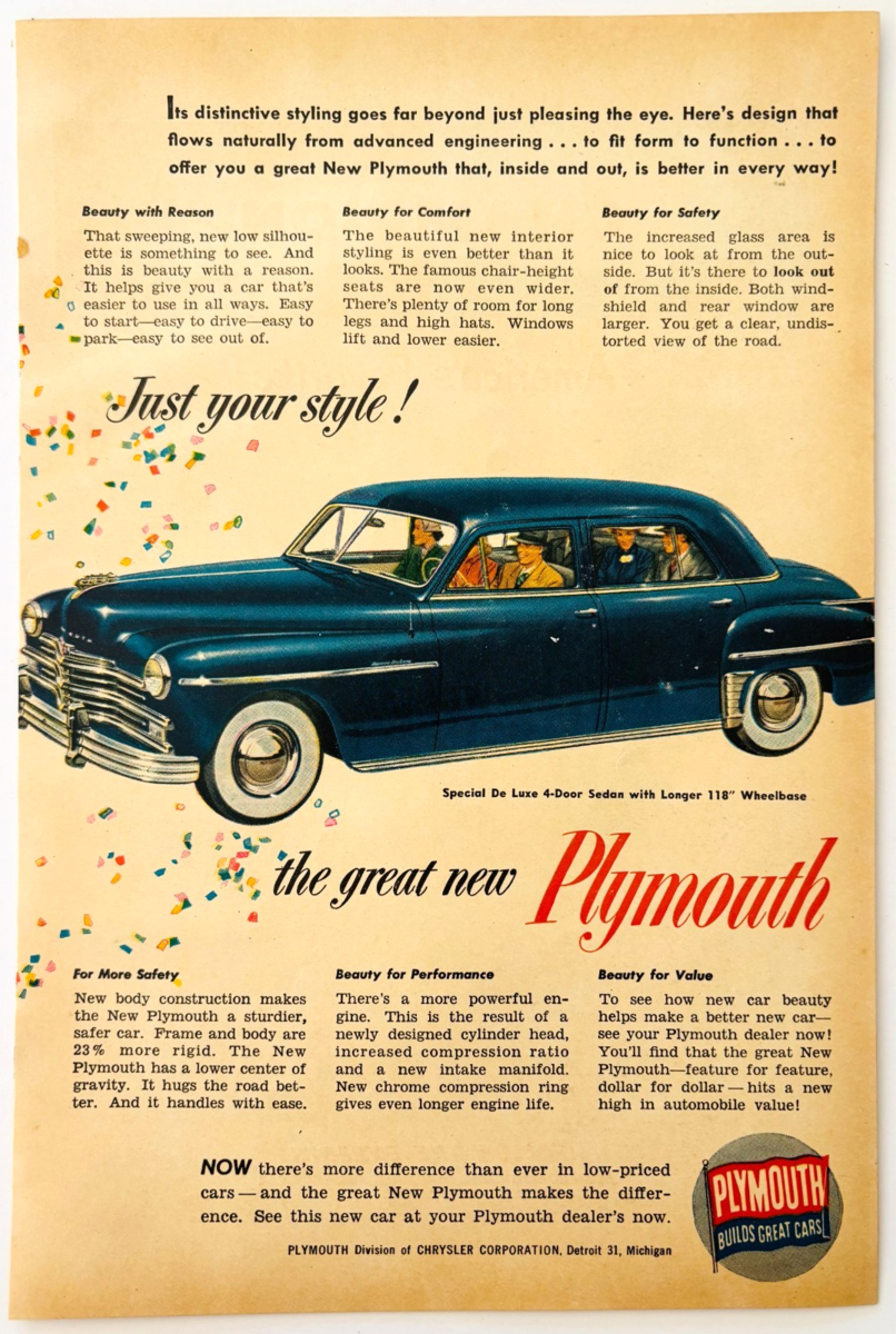 1949 Plymouth De Luxe 4 Door Sedan Advertisement Automobilia Antique DWU16A