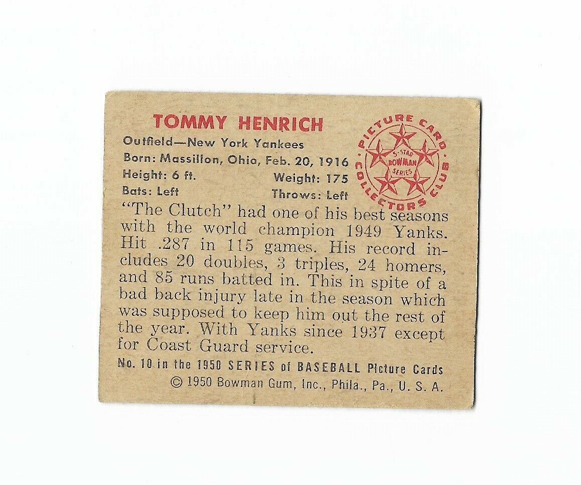 - 1950 Bowman Tommy Henrich #10 New York Yankees Ungraded Vtg Baseball Card