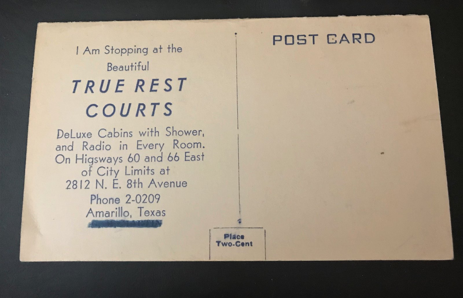 1950's Postcard - Visit Amarillo Texas Halfway Point between Chicago and Los Angeles. This one is an interesting ad postcard advertising True Rest Courts Deluxe Cabins with Shower, and Radio in Every Room. On Highways 60 and 66 East of City Limits at N.E. 8th Avenue Phone 2-0209 Amarillo Texas.