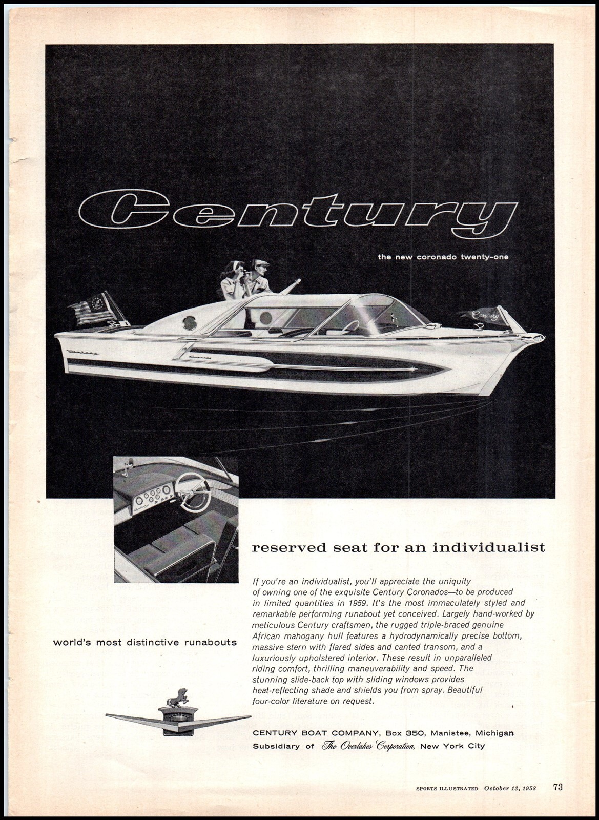 1950s Century Boat Company PRINT AD The New Coronado Twenty One BX3