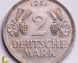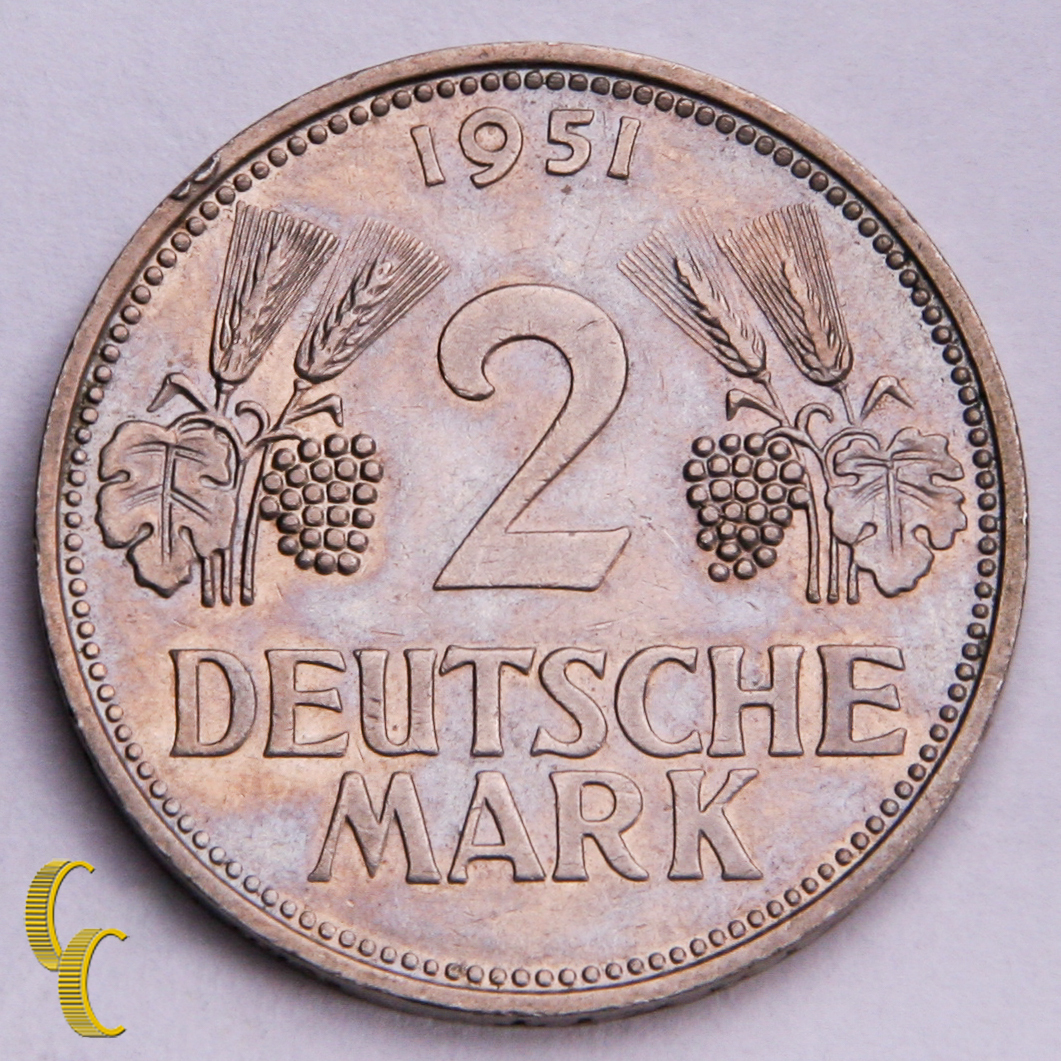 - 1951-F Germany Deutsche 2 Mark 1 Year Issue (XF) Extra Fine Condition