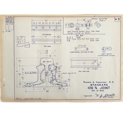 1951 Railroad Bangor Aroostook Standard 100% Joint Rail Blueprint H3 DWDD14